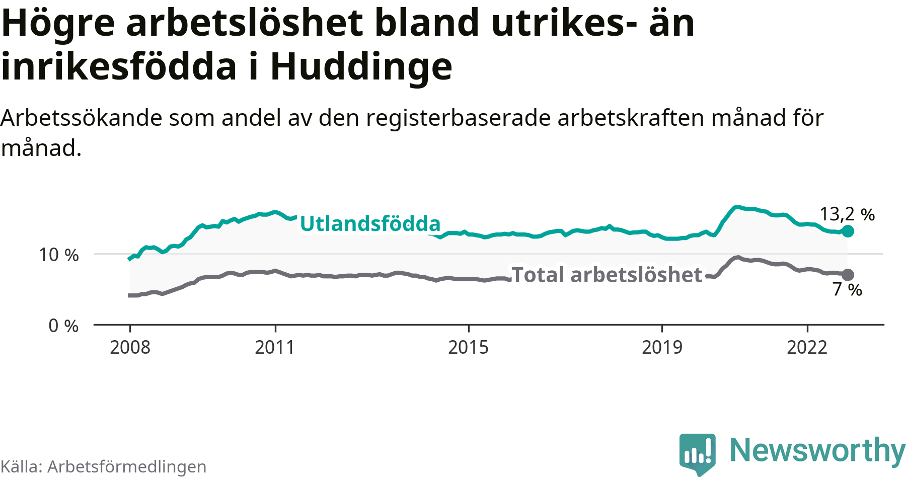 Arbetslösheten bland utlandsfödda var 13,2 procent i Huddinge under november månad, motsvarande 2 818 av 21 348 personer. Det är 0,9 procentenheter färre än vid samma tidpunkt i fjol (−250 om man räknar personer). Därmed är de utlandsföddas arbetslöshet lägre än vid samma tidpunkt i fjol för 18:e månaden i följd. Sedan maj 2021 har arbetslösheten bland utlandsfödda minskat från 15,4 till 13,2 procent.