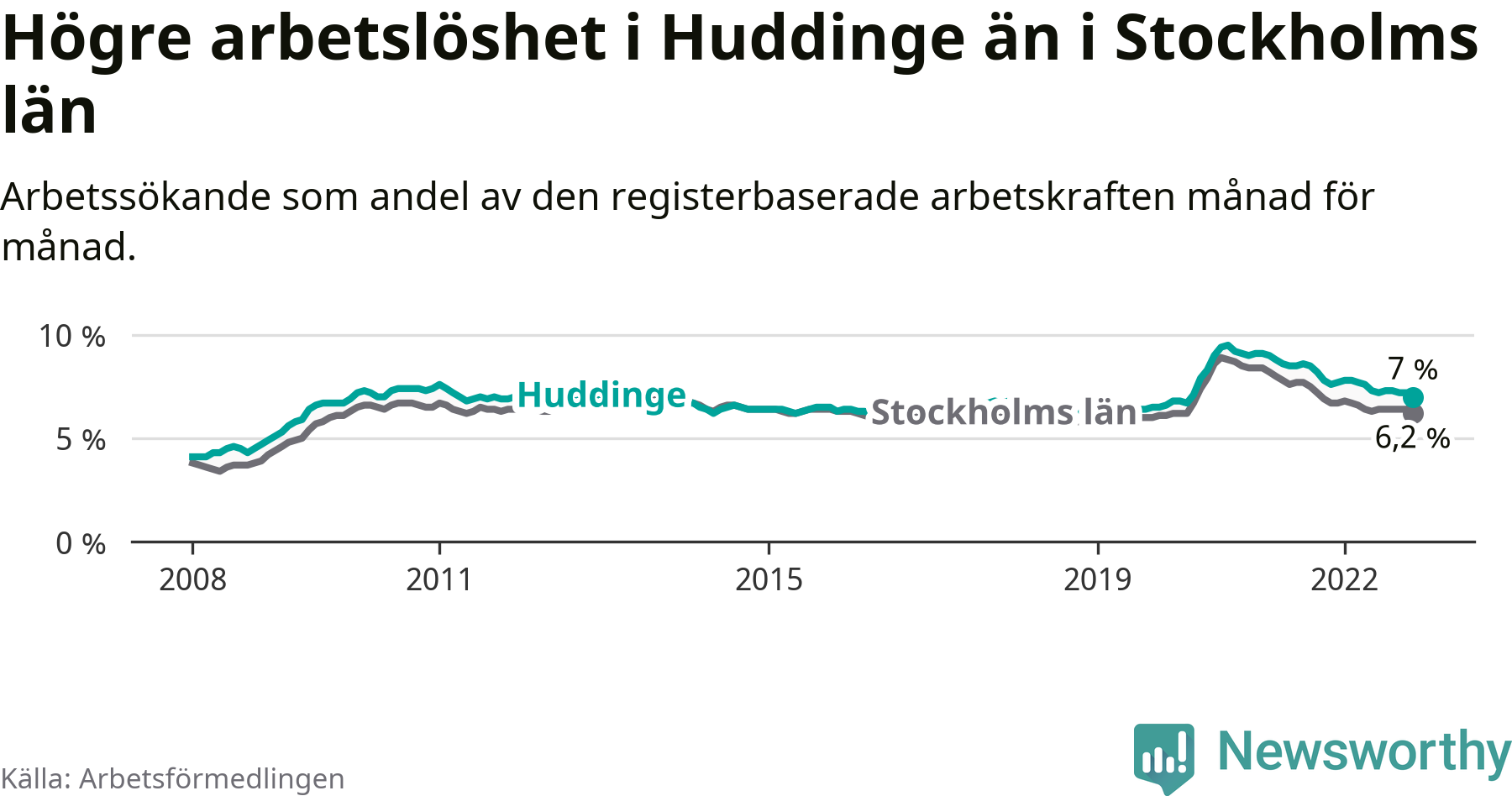 Även om arbetslösheten i Huddinge alltså minskar, så ligger den fortfarande över snittet i hela Stockholms län (7,0 procent i kommunen, jämfört med 6,2 procent i hela länet). Ekerö har den lägsta arbetslösheten i länet (3,1 procent), medan Botkyrka har den högsta (11,1 procent). För att Huddinge skulle komma ner i samma arbetslöshetsnivå som Ekerö skulle 2 268 personer behöva sysselsättas.