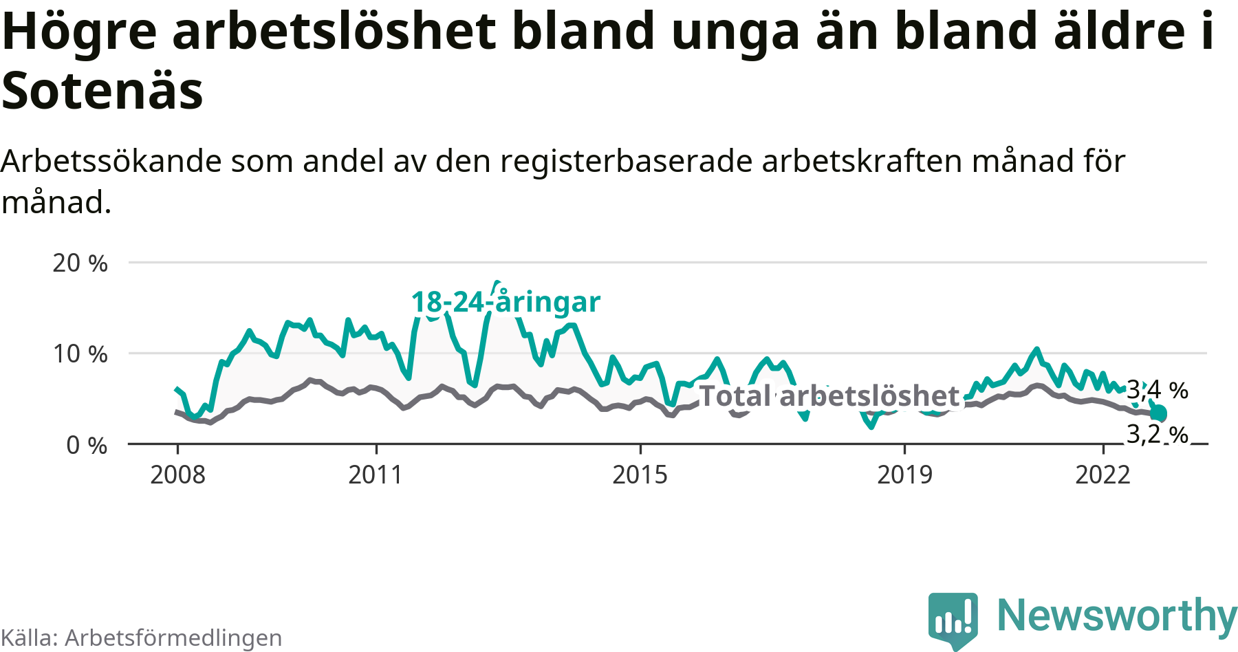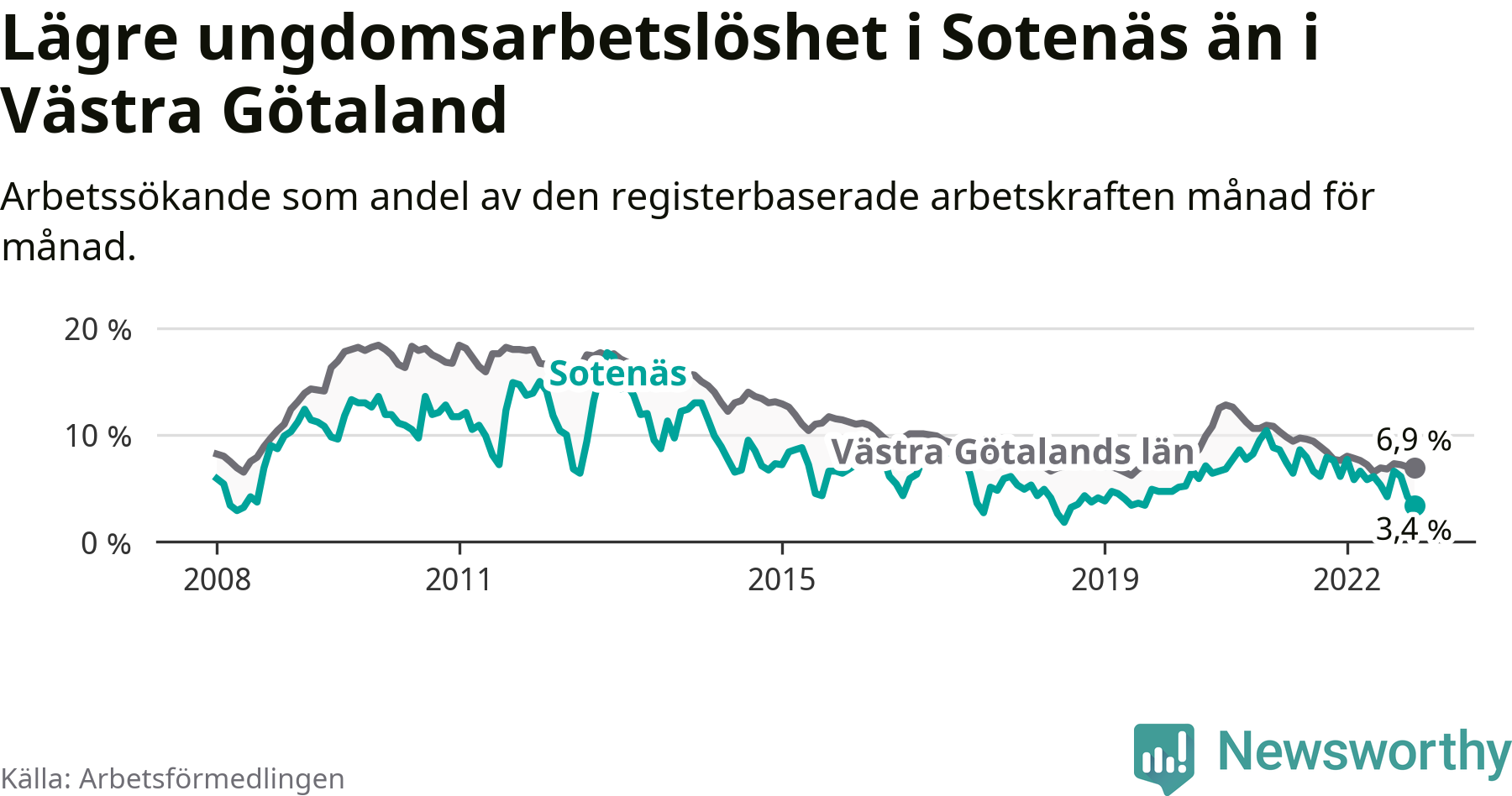 Precis som den totala arbetslösheten ligger ungdomsarbetslösheten i Sotenäs lägre än i Västra Götaland som helhet. Skillnaden mellan kommunen och länet är 3,5 procentenheter.