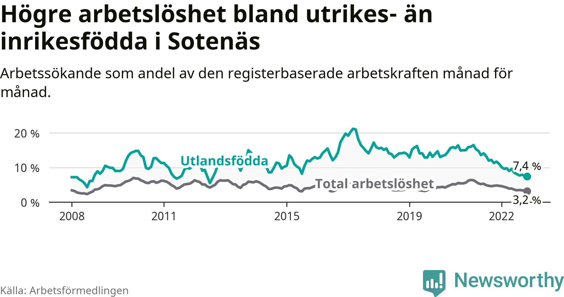 Arbetslösheten bland utlandsfödda var 7,4 procent i Sotenäs under november månad, motsvarande 36 av 486 personer. Det är 4,3 procentenheter färre än vid samma tidpunkt i fjol (−21 om man räknar personer). Därmed är de utlandsföddas arbetslöshet lägre än vid samma tidpunkt i fjol för 19:e månaden i följd. Sedan april 2021 har arbetslösheten bland utlandsfödda minskat från 14,8 till 7,4 procent. Den nuvarande arbetslöshetsnivån är den lägsta sedan augusti 2012.