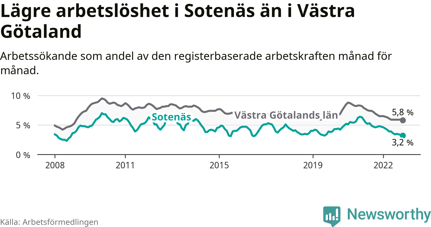 Det är 17:e månaden i följd som arbetslösheten i Sotenäs är lägre än den var under samma tidpunkt året innan. Sedan juni 2021 har arbetslösheten gått ner från 5,3 till 3,2 procent. Den nuvarande arbetslöshetsnivån är därmed den lägsta sedan juli 2019.