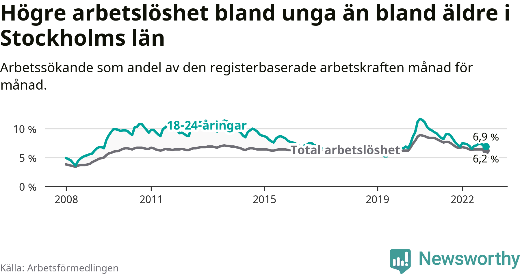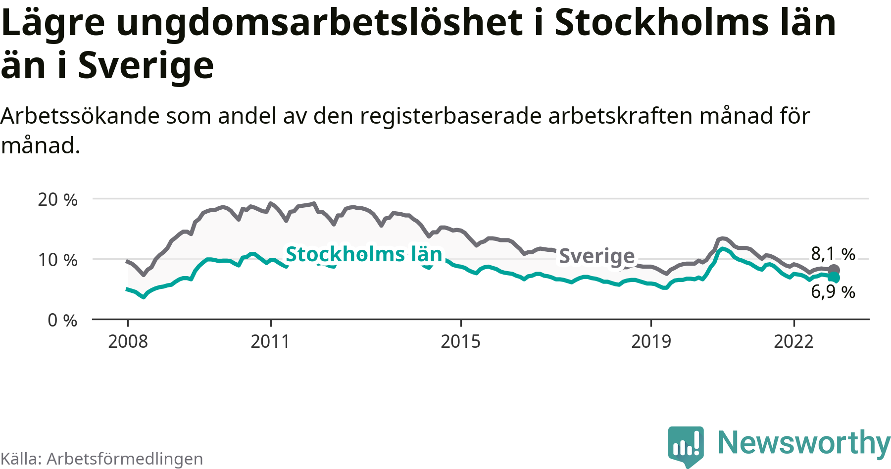 Precis som den totala arbetslösheten ligger ungdomsarbetslösheten i Stockholm lägre än i Sverige som helhet. Skillnaden mellan länet och riket är 1,2 procentenheter.