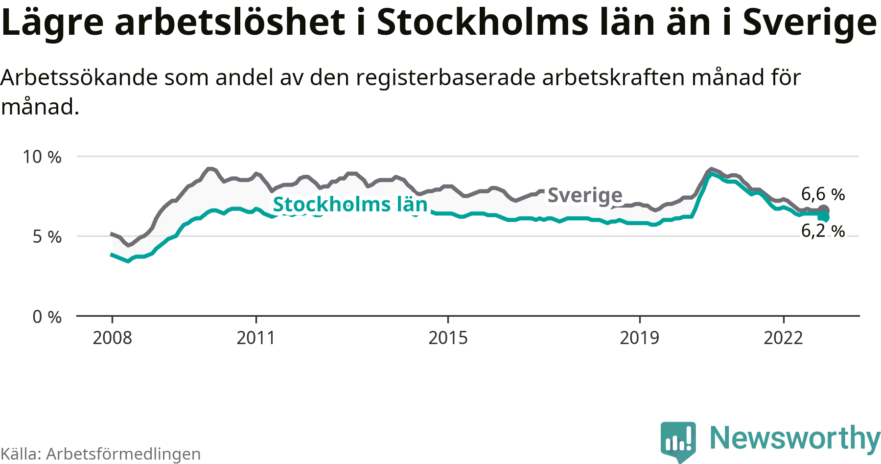 Stockholms län hade redan tidigare lägre arbetslöshet än snittet i hela Sverige och nu växer klyftan (6,2 procent i länet, jämfört med 6,6 procent i hela riket). Västerbotten har den lägsta arbetslösheten i riket (4,1 procent), medan Södermanland har den högsta (9,0 procent). För att Stockholms län skulle komma ner i samma arbetslöshetsnivå som Västerbotten skulle 26 025 personer behöva sysselsättas.