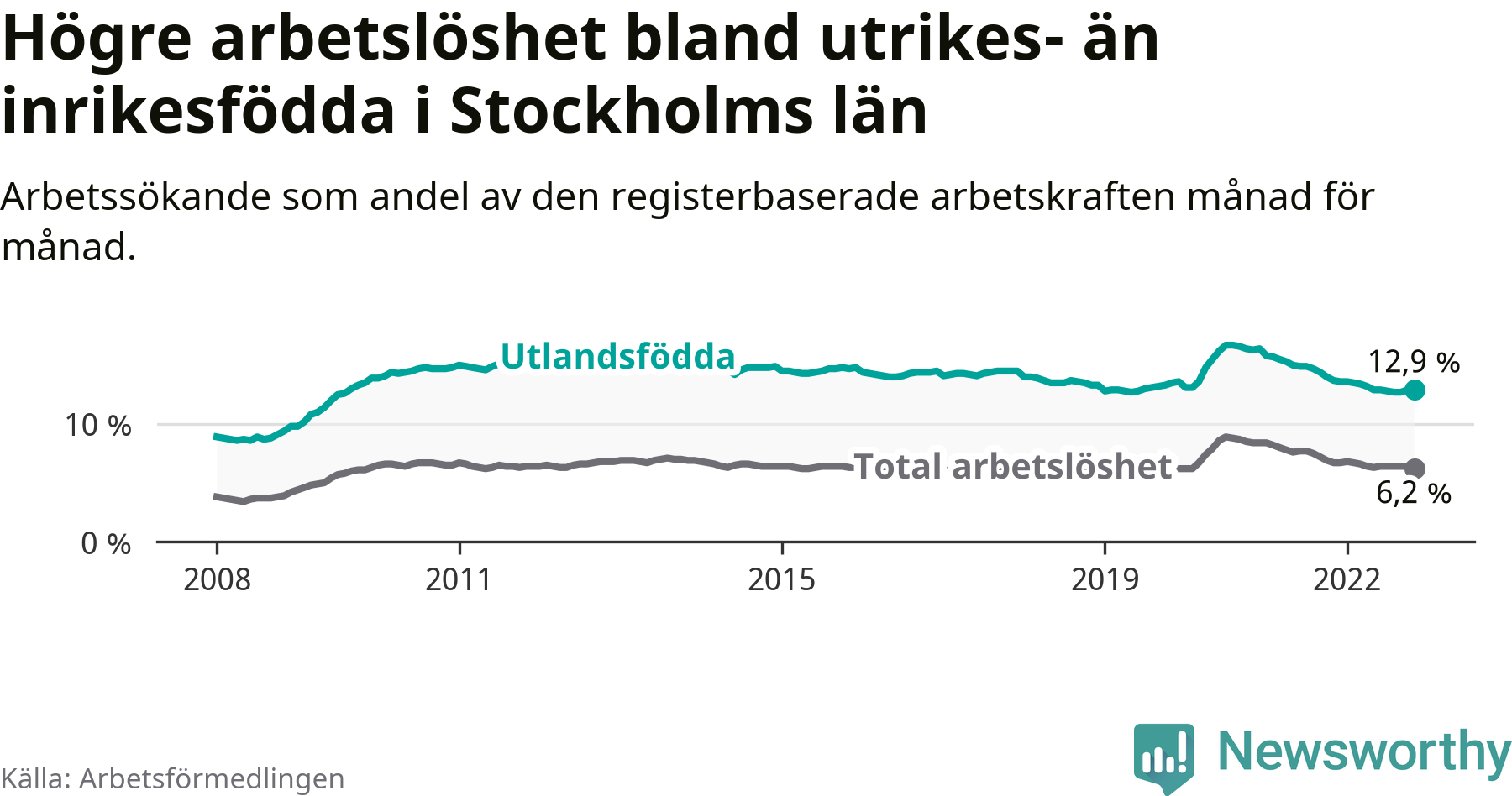 Arbetslösheten bland utlandsfödda var 12,9 procent i Stockholm under november månad, motsvarande 48 966 av 379 581 personer. Det är 0,8 procentenheter färre än vid samma tidpunkt i fjol (−3 654 om man räknar personer). Därmed är de utlandsföddas arbetslöshet lägre än vid samma tidpunkt i fjol för 19:e månaden i följd. Sedan april 2021 har arbetslösheten bland utlandsfödda minskat från 15,3 till 12,9 procent.
