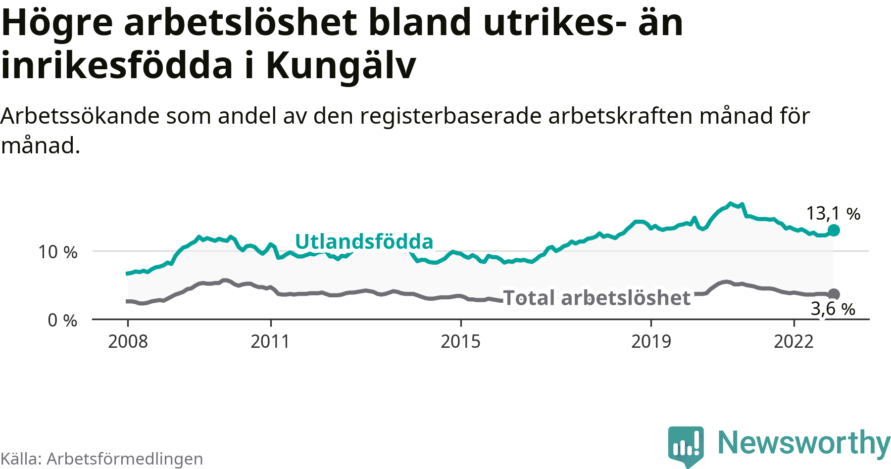Skillnaden i arbetslöshet mellan utrikesfödda och hela befolkningen är 9,5 procentenheter i Kungälv.