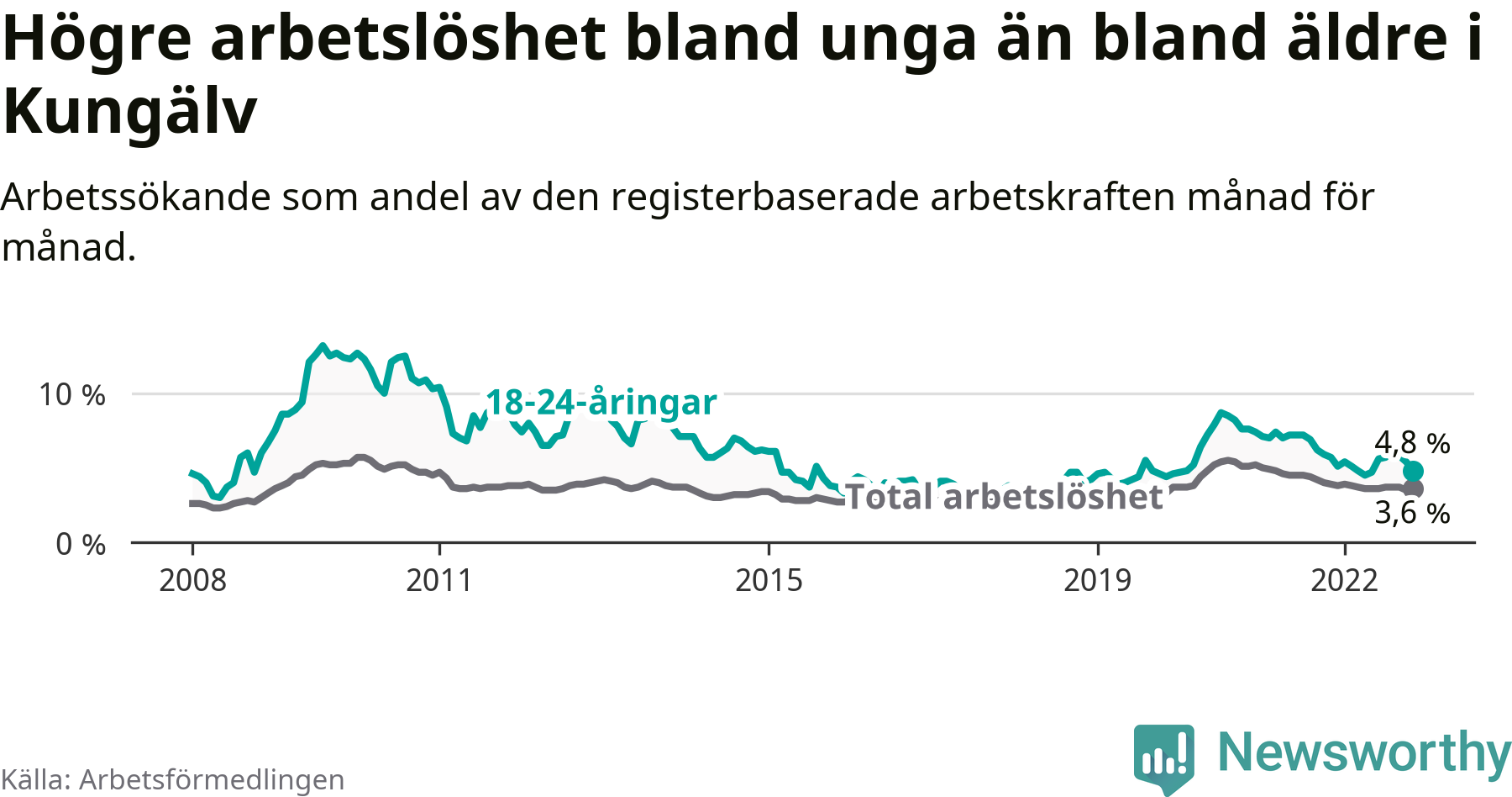 Precis som den totala arbetslösheten ligger ungdomsarbetslösheten i Kungälv lägre än i Västra Götaland som helhet. Skillnaden mellan kommunen och länet är 2,1 procentenheter.