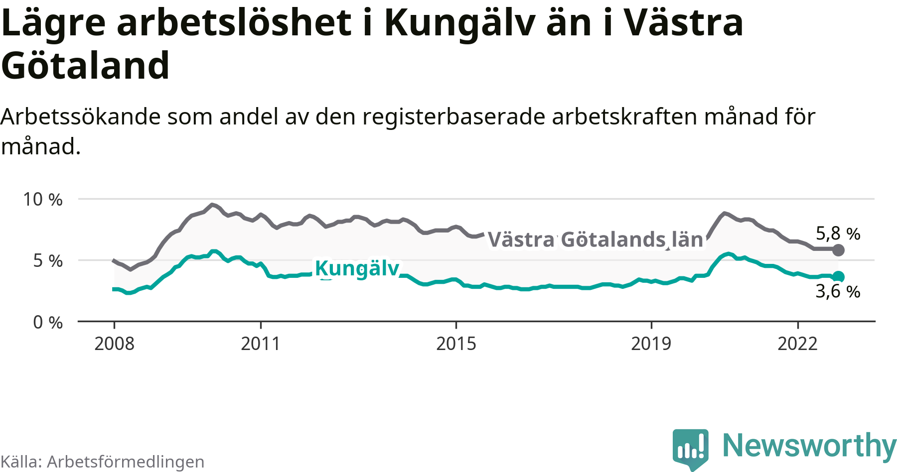 Kungälv hade redan tidigare lägre arbetslöshet än snittet i hela Västra Götalands län och nu växer klyftan (3,6 procent i kommunen, jämfört med 5,8 procent i hela länet). Öckerö har den lägsta arbetslösheten i länet (2,5 procent), medan Trollhättan och Åmål har den högsta (9,1 procent). För att Kungälv skulle komma ner i samma arbetslöshetsnivå som Öckerö skulle 258 personer behöva sysselsättas.