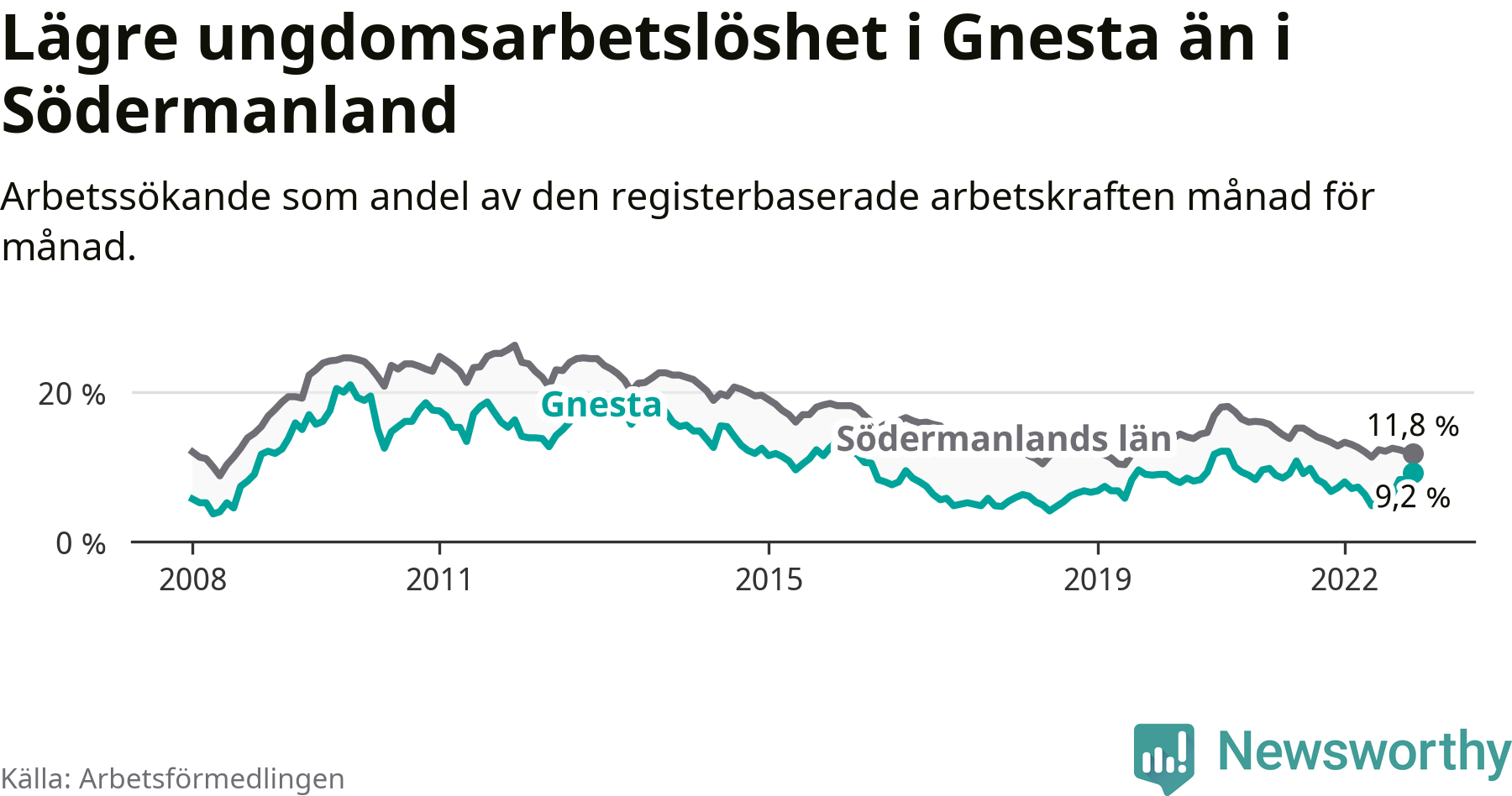 Precis som den totala arbetslösheten ligger ungdomsarbetslösheten i Gnesta lägre än i Södermanland som helhet. Skillnaden mellan kommunen och länet är 2,6 procentenheter.