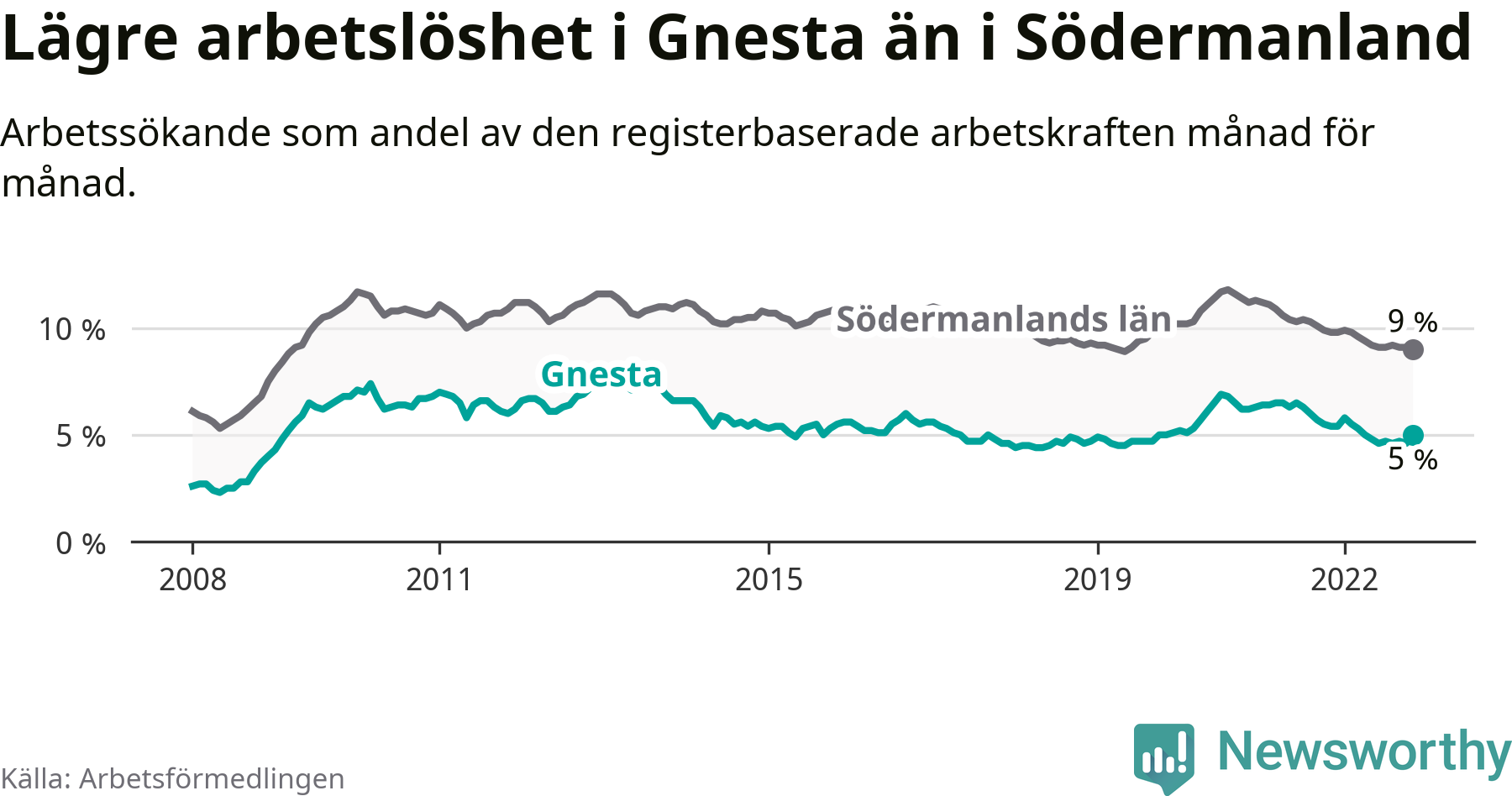 Det är 17:e månaden i följd som arbetslösheten i Gnesta är lägre än den var under samma tidpunkt året innan. Sedan juni 2021 har arbetslösheten gått ner från 6,5 till 5,0 procent.