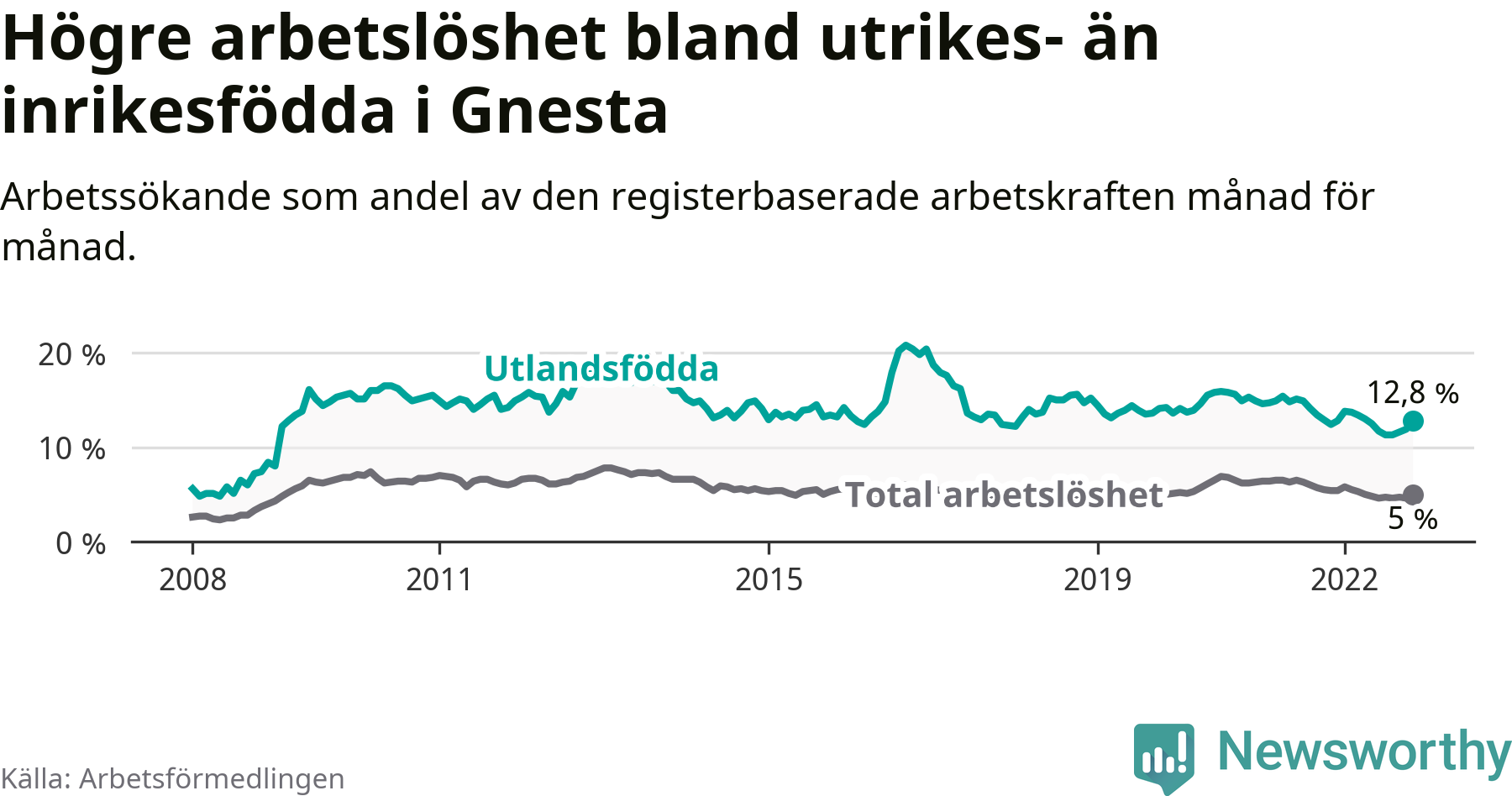 Arbetslösheten bland utlandsfödda var 12,8 procent i Gnesta under november månad, motsvarande 104 av 813 personer. Det är 0,4 procentenheter fler än vid samma tidpunkt i fjol (+4 om man räknar personer). Den senaste månadens uppgång innebär ett trendbrott. Under de 18 föregående månaderna hade arbetslösheten bland utlandsfödda varit lägre än motsvarande tidpunkt året innan.