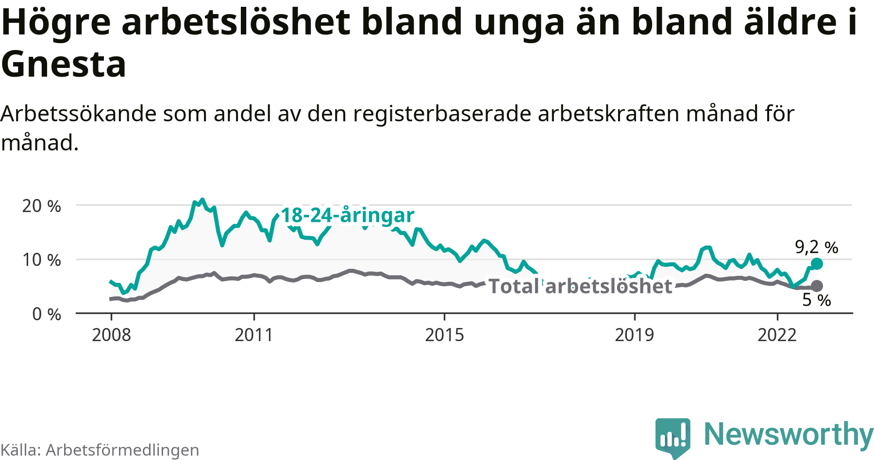 Till skillnad från den totala arbetslösheten stiger arbetslösheten bland unga (+2,5 procentenheter). I november var 9,2 procent av 18–24-åringarna inskrivna som arbetssökande (motsvarande 36 personer). Mäter vi antalet inskrivna ser vi en ökning med åtta personer på ett års sikt.