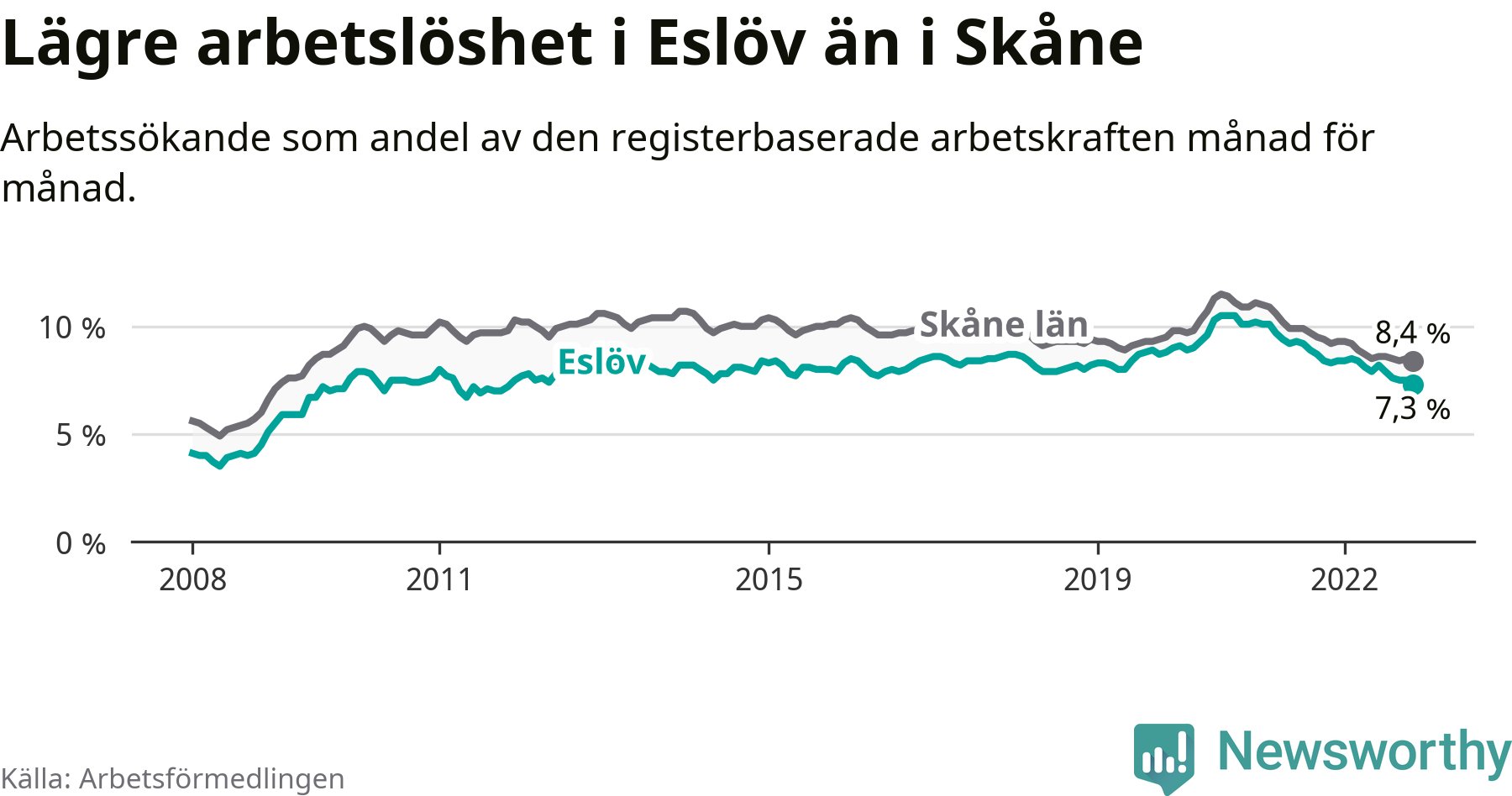 Eslöv hade redan tidigare lägre arbetslöshet än snittet i hela Skåne län och nu växer klyftan (7,3 procent i kommunen, jämfört med 8,4 procent i hela länet). Lomma och Vellinge har den lägsta arbetslösheten i länet (3,2 procent), medan Perstorp har den högsta (12,6 procent). För att Eslöv skulle komma ner i samma arbetslöshetsnivå som Lomma och Vellinge skulle 681 personer behöva sysselsättas.