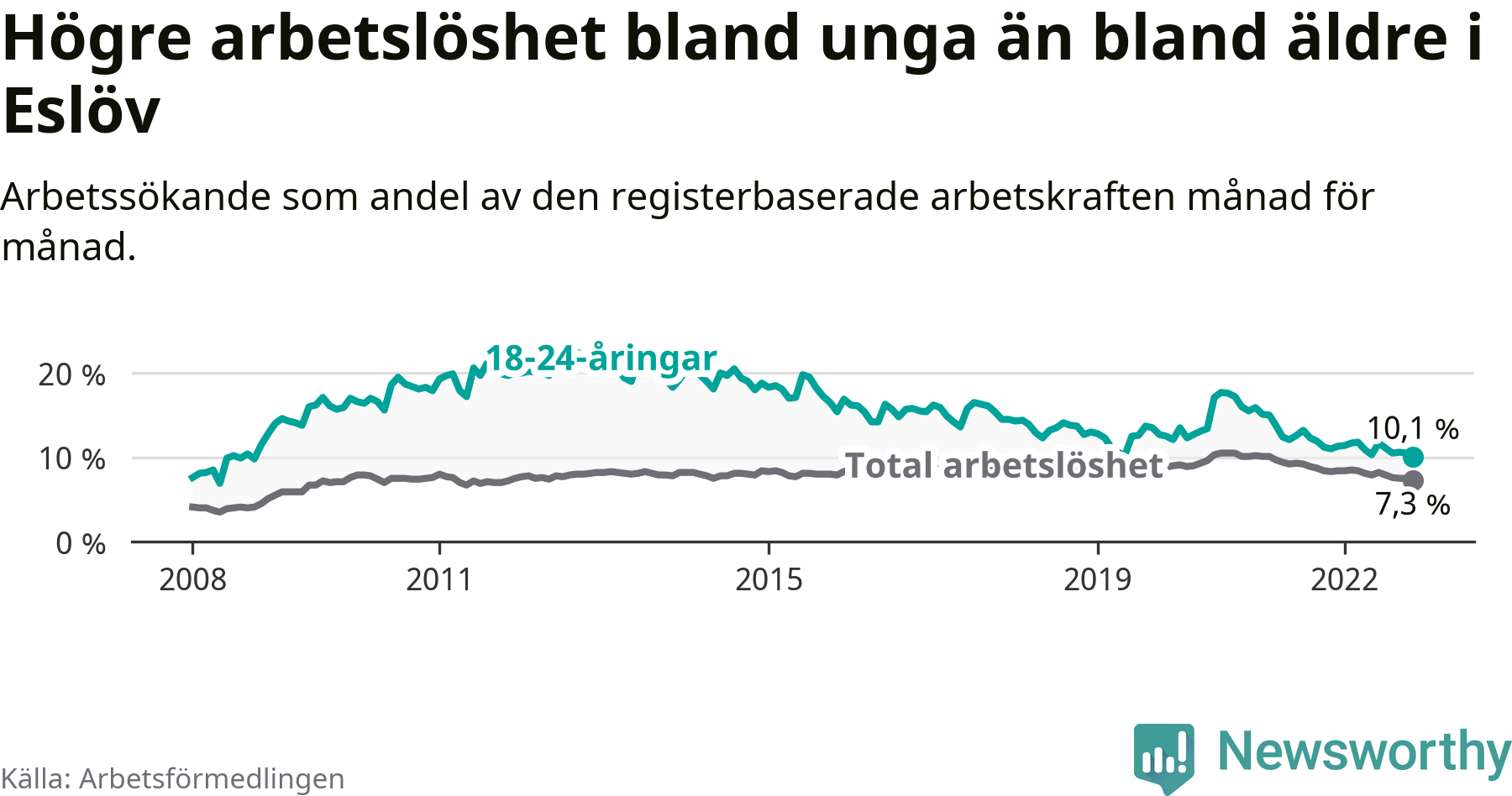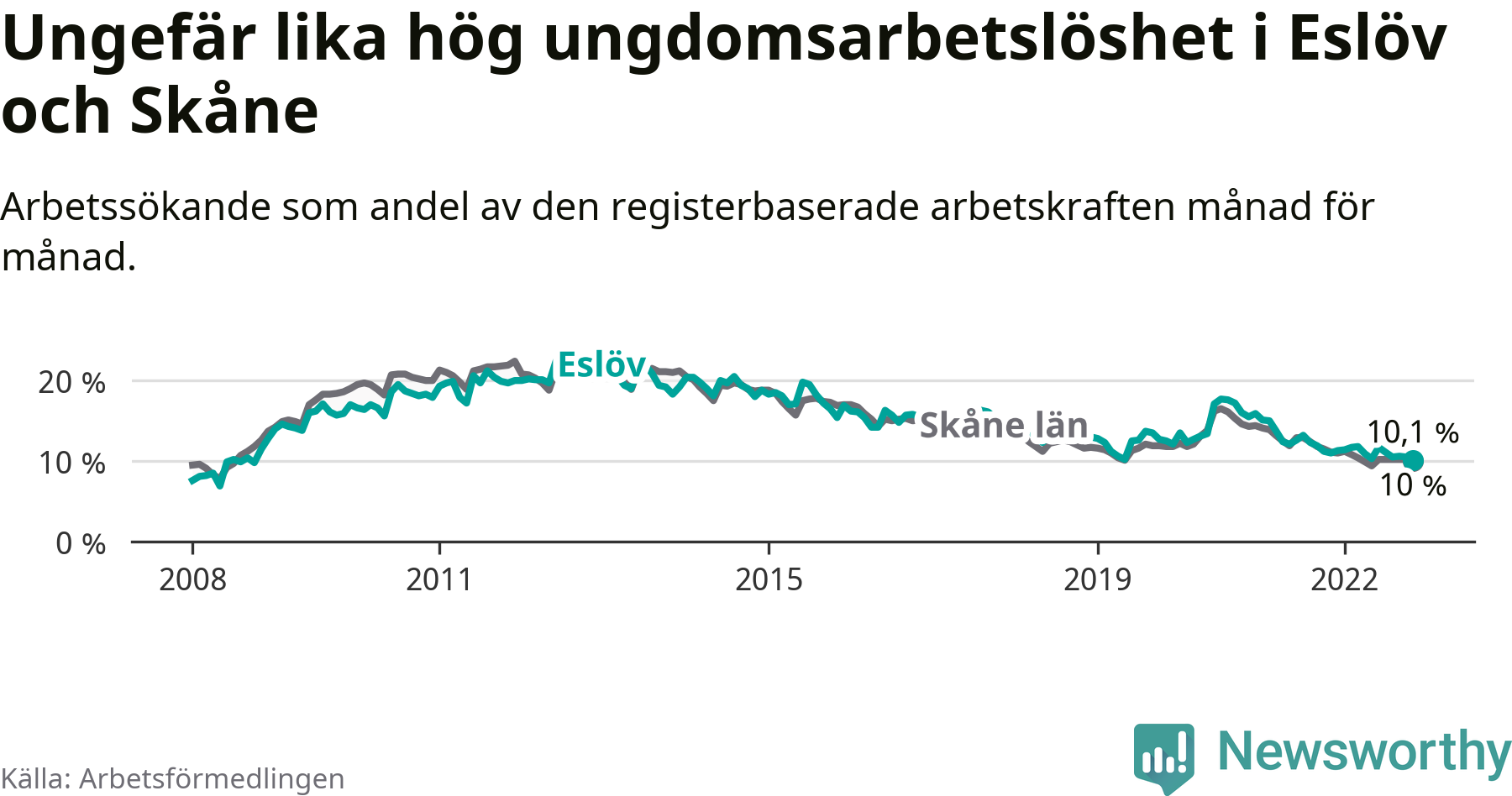 Medan Eslöv har lägre total arbetslöshet än Skåne, ligger ungdomsarbetslösheten på i stort sett samma nivå.