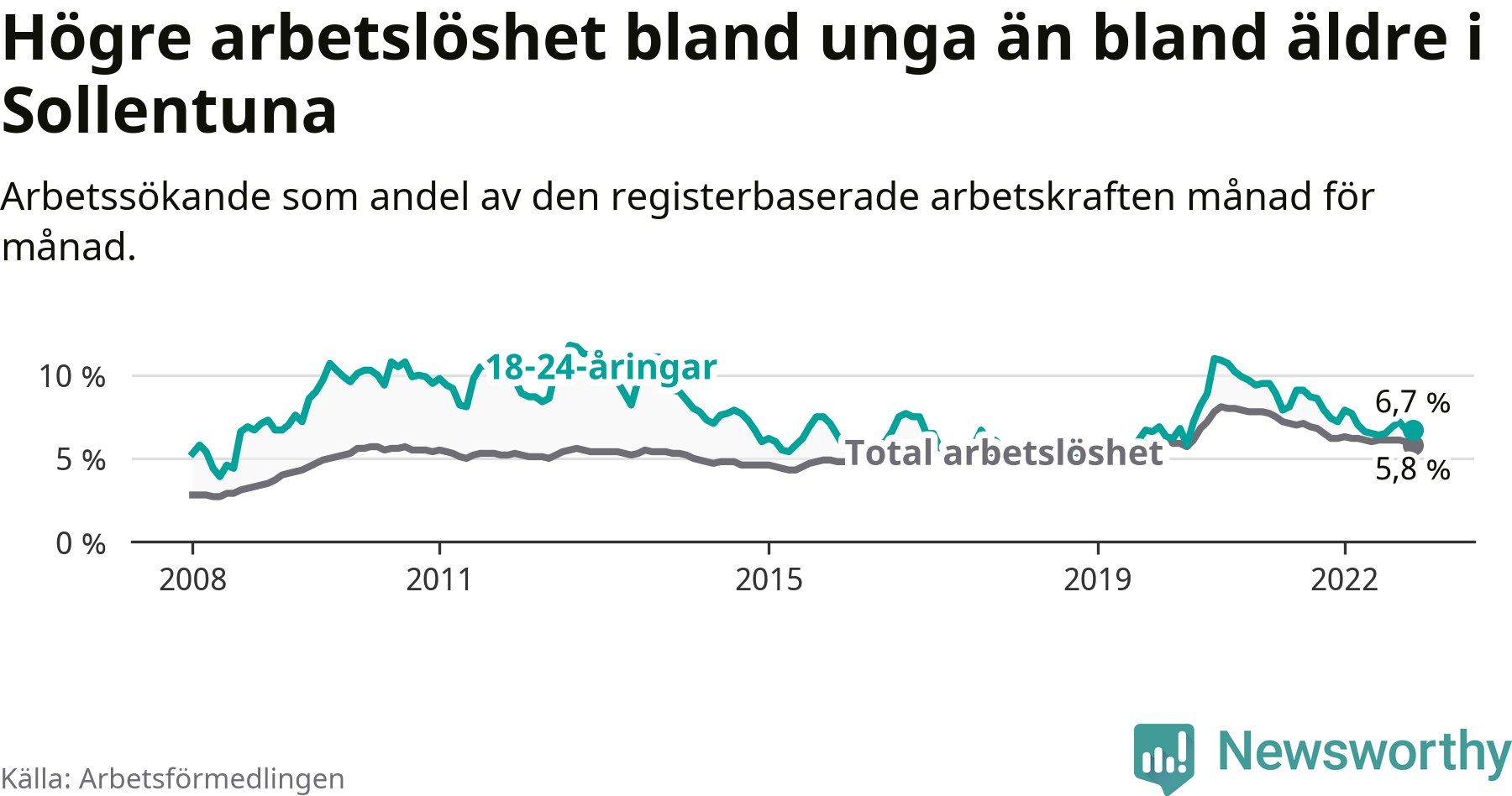 I och med den senaste månadens nedgång har de ungas arbetslöshet i Sollentuna sjunkit 20 månader i följd (ner från 8,9 procent i mars 2021 till 6,7 procent nu).