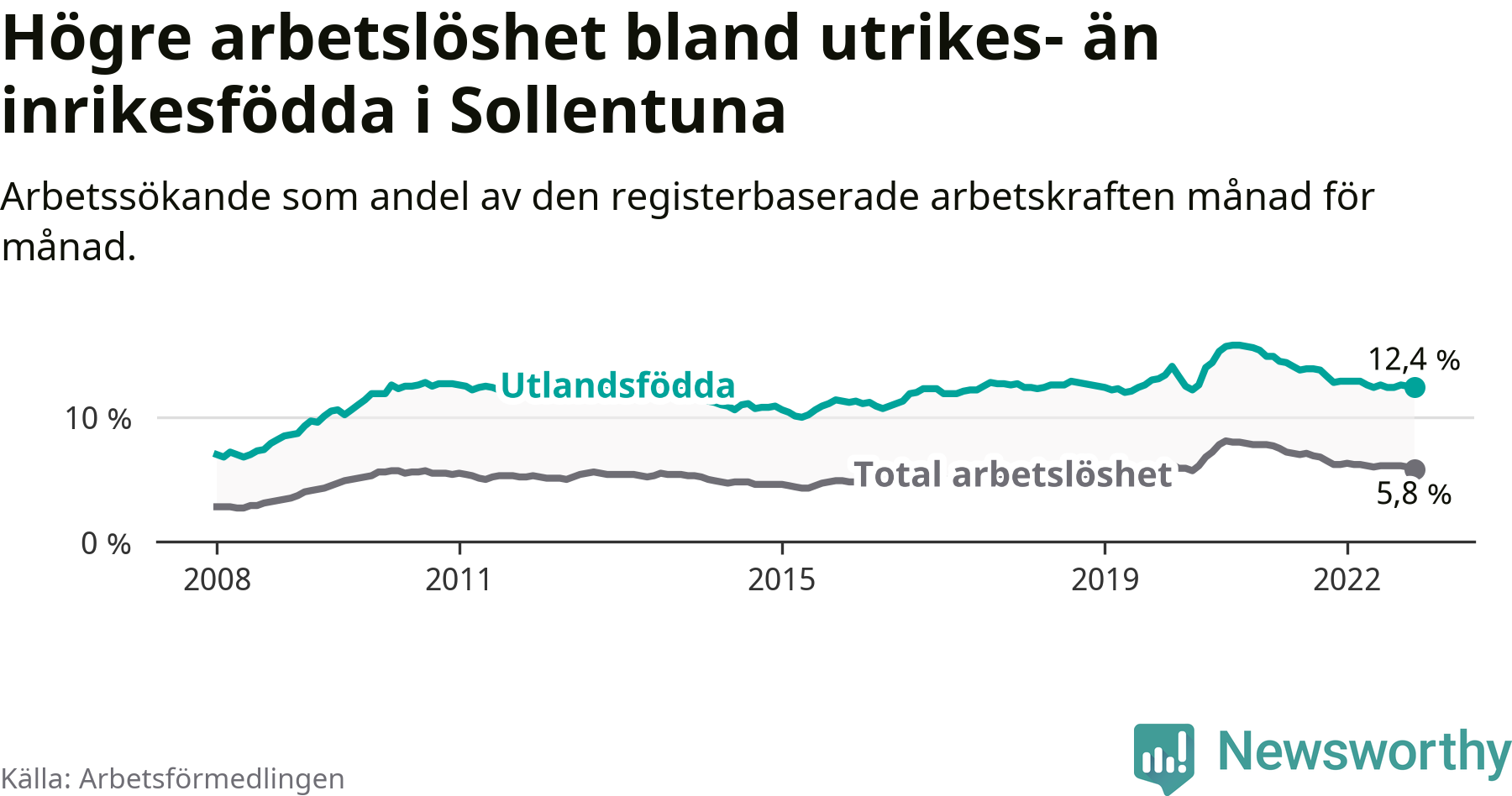 | Bland utlandsfödda | 12,4 % | −0,4 % ▼ | 12,9 % | −0,8 % ▼ | 16,5 % | −1,3 % ▼ |