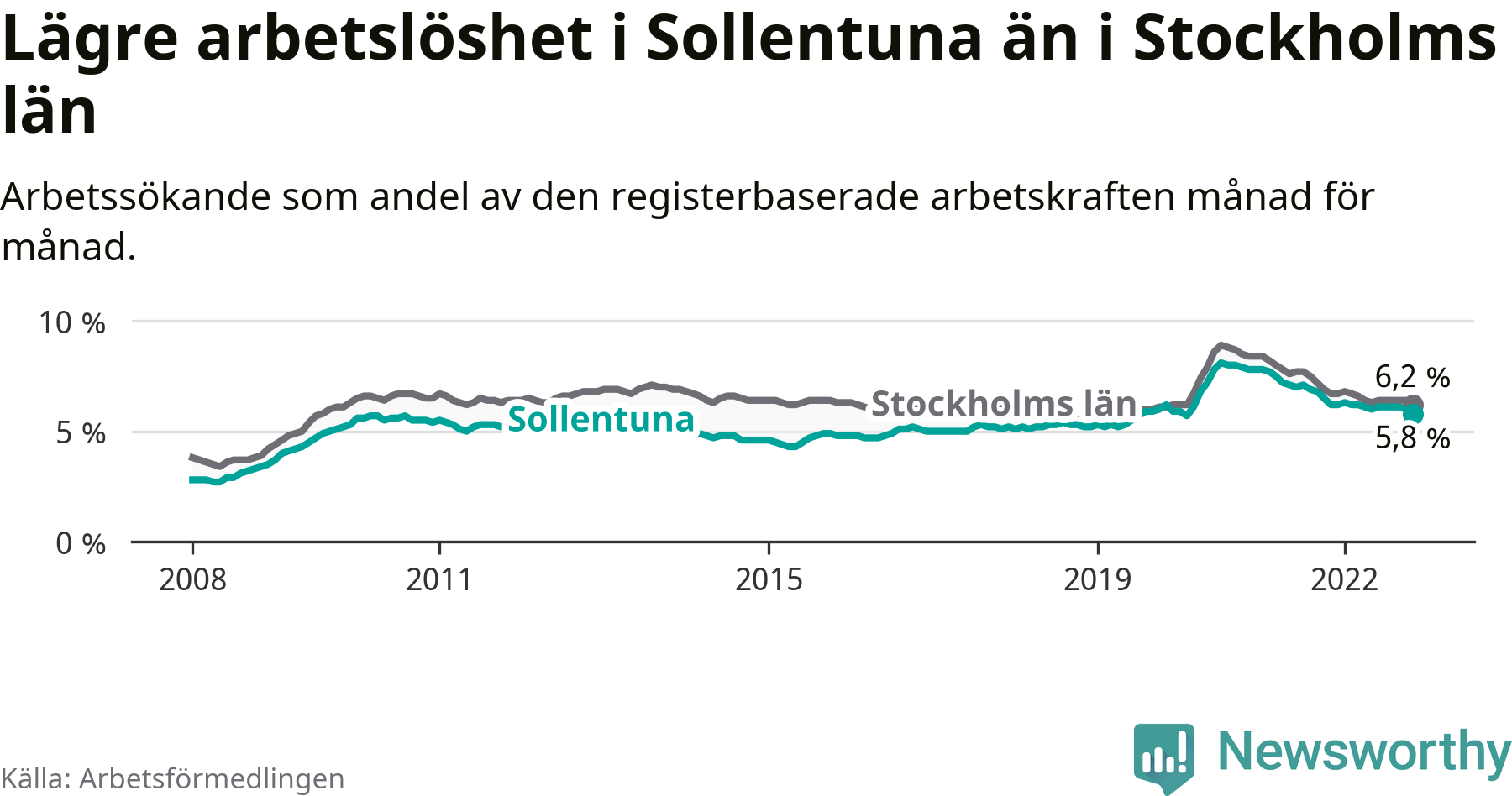Sollentuna hade redan tidigare lägre arbetslöshet än snittet i hela Stockholms län och nu växer klyftan (5,8 procent i kommunen, jämfört med 6,2 procent i hela länet). Ekerö har den lägsta arbetslösheten i länet (3,1 procent), medan Botkyrka har den högsta (11,1 procent). För att Sollentuna skulle komma ner i samma arbetslöshetsnivå som Ekerö skulle 992 personer behöva sysselsättas.
