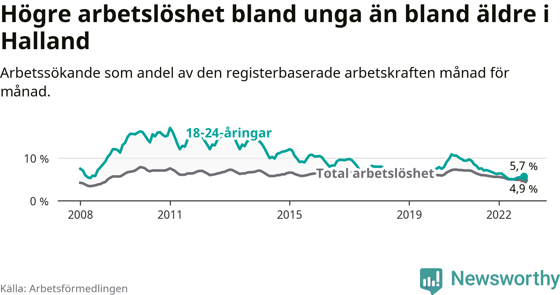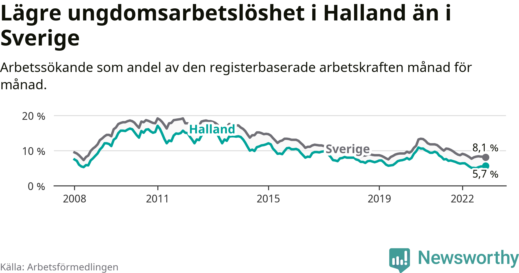 Precis som den totala arbetslösheten ligger ungdomsarbetslösheten i Halland lägre än i Sverige som helhet. Skillnaden mellan länet och riket är 2,4 procentenheter.