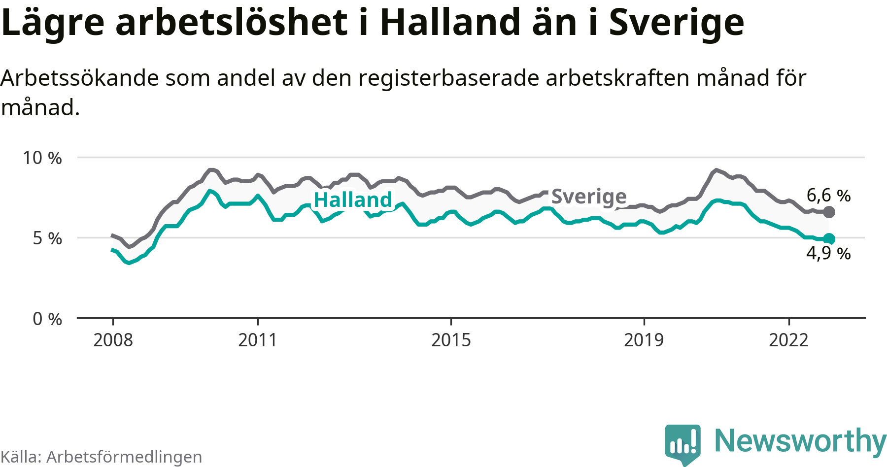 Det är 20:e månaden i följd som arbetslösheten i Halland är lägre än den var under samma tidpunkt året innan. Sedan mars 2021 har arbetslösheten gått ner från 6,7 till 4,9 procent.