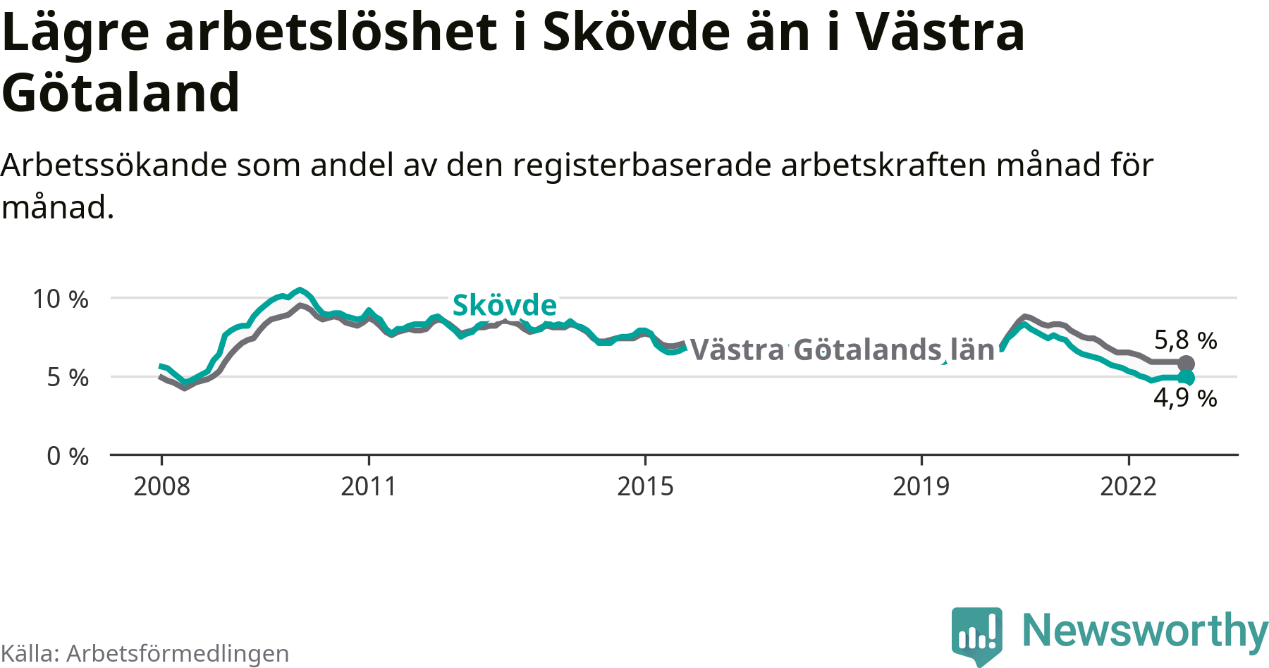 Skövde hade redan tidigare lägre arbetslöshet än snittet i hela Västra Götalands län och nu växer klyftan (4,9 procent i kommunen, jämfört med 5,8 procent i hela länet). Öckerö har den lägsta arbetslösheten i länet (2,5 procent), medan Trollhättan och Åmål har den högsta (9,1 procent). För att Skövde skulle komma ner i samma arbetslöshetsnivå som Öckerö skulle 672 personer behöva sysselsättas.