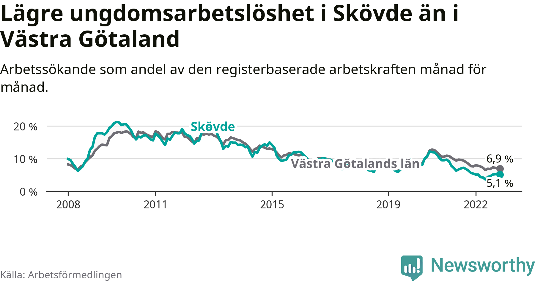 Precis som den totala arbetslösheten ligger ungdomsarbetslösheten i Skövde lägre än i Västra Götaland som helhet. Skillnaden mellan kommunen och länet är 1,8 procentenheter.