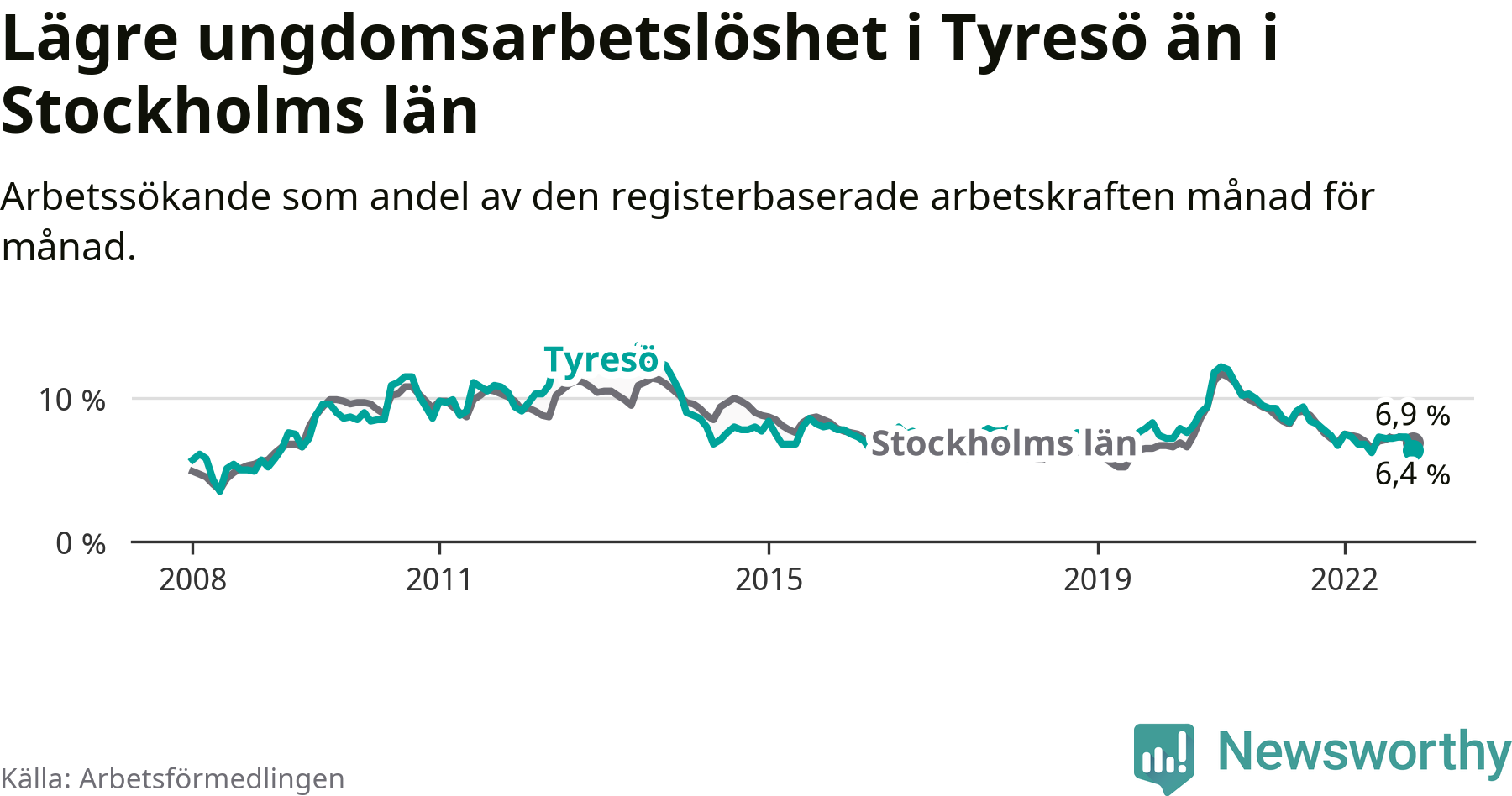 Precis som den totala arbetslösheten ligger ungdomsarbetslösheten i Tyresö lägre än i Stockholms län som helhet. Skillnaden mellan kommunen och länet är 0,5 procentenheter.