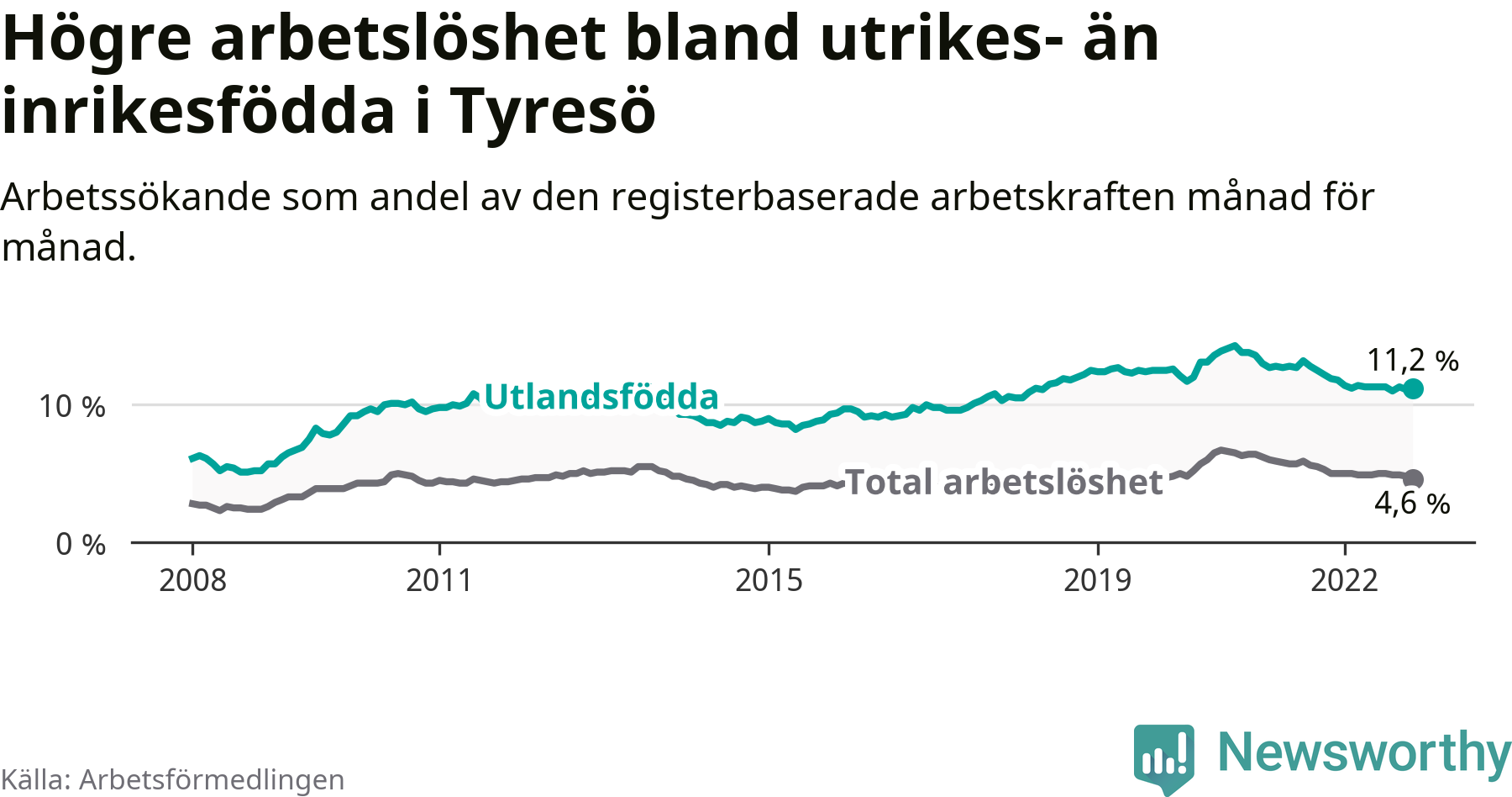 Arbetslösheten bland utlandsfödda var 11,2 procent i Tyresö under november månad, motsvarande 551 av 4 920 personer. Det är 0,7 procentenheter färre än vid samma tidpunkt i fjol (−25 om man räknar personer). Därmed är de utlandsföddas arbetslöshet lägre än vid samma tidpunkt i fjol för 20:e månaden i följd. Sedan mars 2021 har arbetslösheten bland utlandsfödda minskat från 12,8 till 11,2 procent.