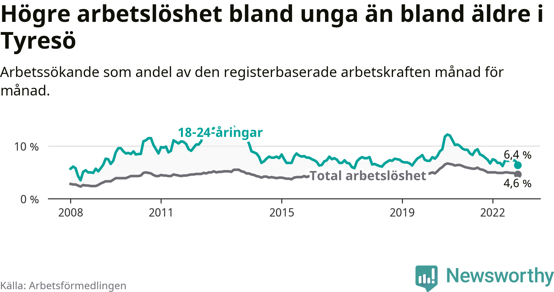 I och med den senaste månadens nedgång har de ungas arbetslöshet i Tyresö sjunkit 20 månader i följd (ner från 9,3 procent i mars 2021 till 6,4 procent nu).