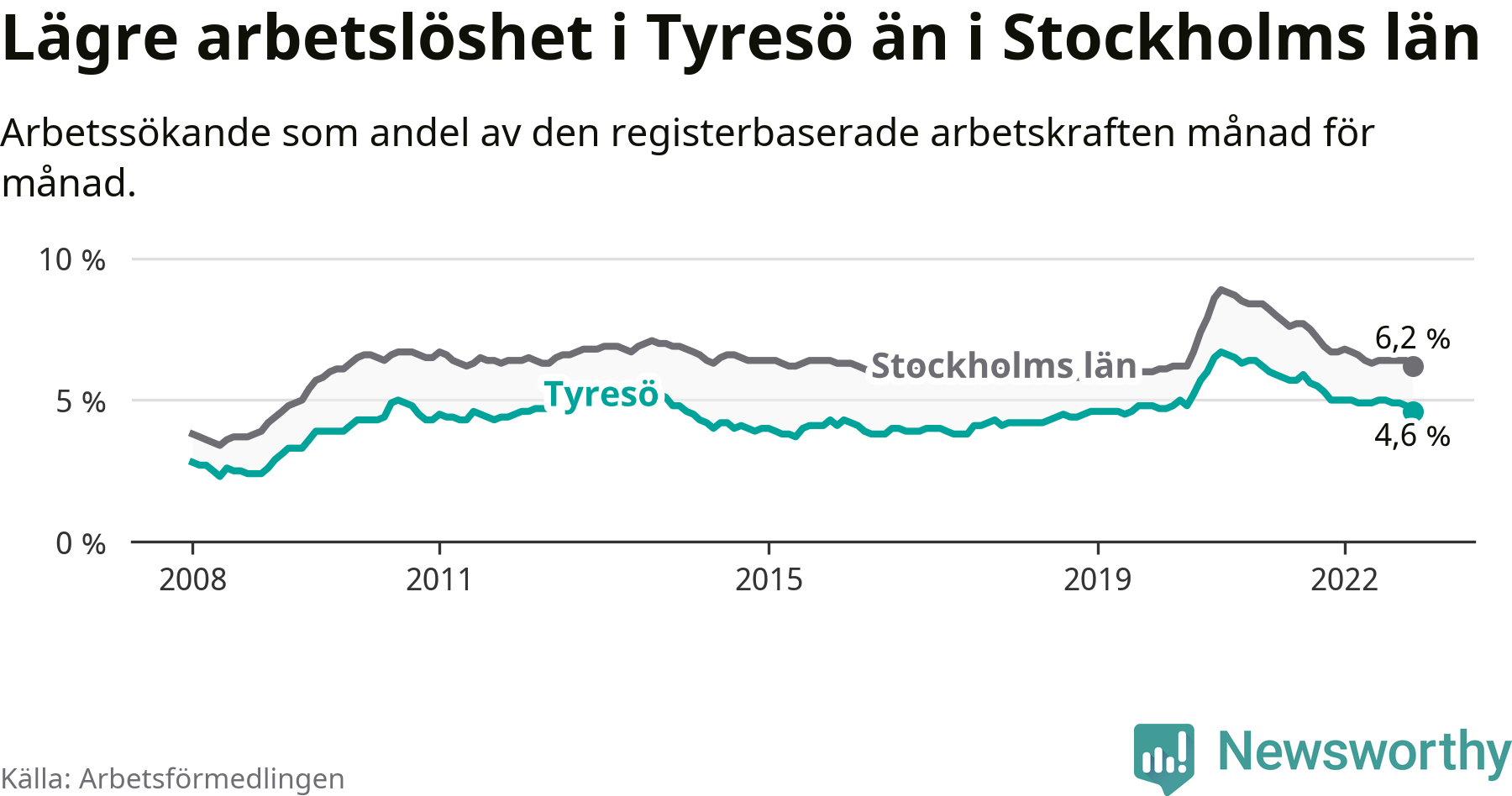Tyresö hade redan tidigare lägre arbetslöshet än snittet i hela Stockholms län och nu växer klyftan (4,6 procent i kommunen, jämfört med 6,2 procent i hela länet). Ekerö har den lägsta arbetslösheten i länet (3,1 procent), medan Botkyrka har den högsta (11,1 procent). För att Tyresö skulle komma ner i samma arbetslöshetsnivå som Ekerö skulle 367 personer behöva sysselsättas.