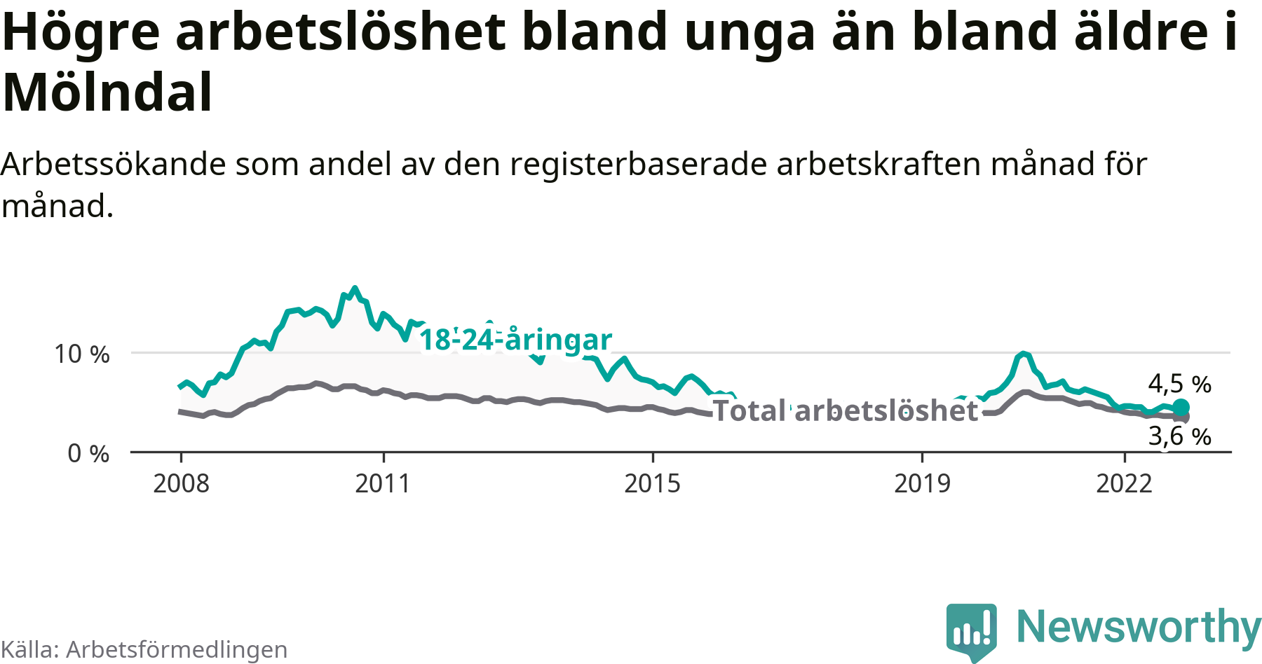 I och med den senaste månadens nedgång har de ungas arbetslöshet i Mölndal sjunkit 20 månader i följd (ner från 6,3 procent i mars 2021 till 4,5 procent nu).