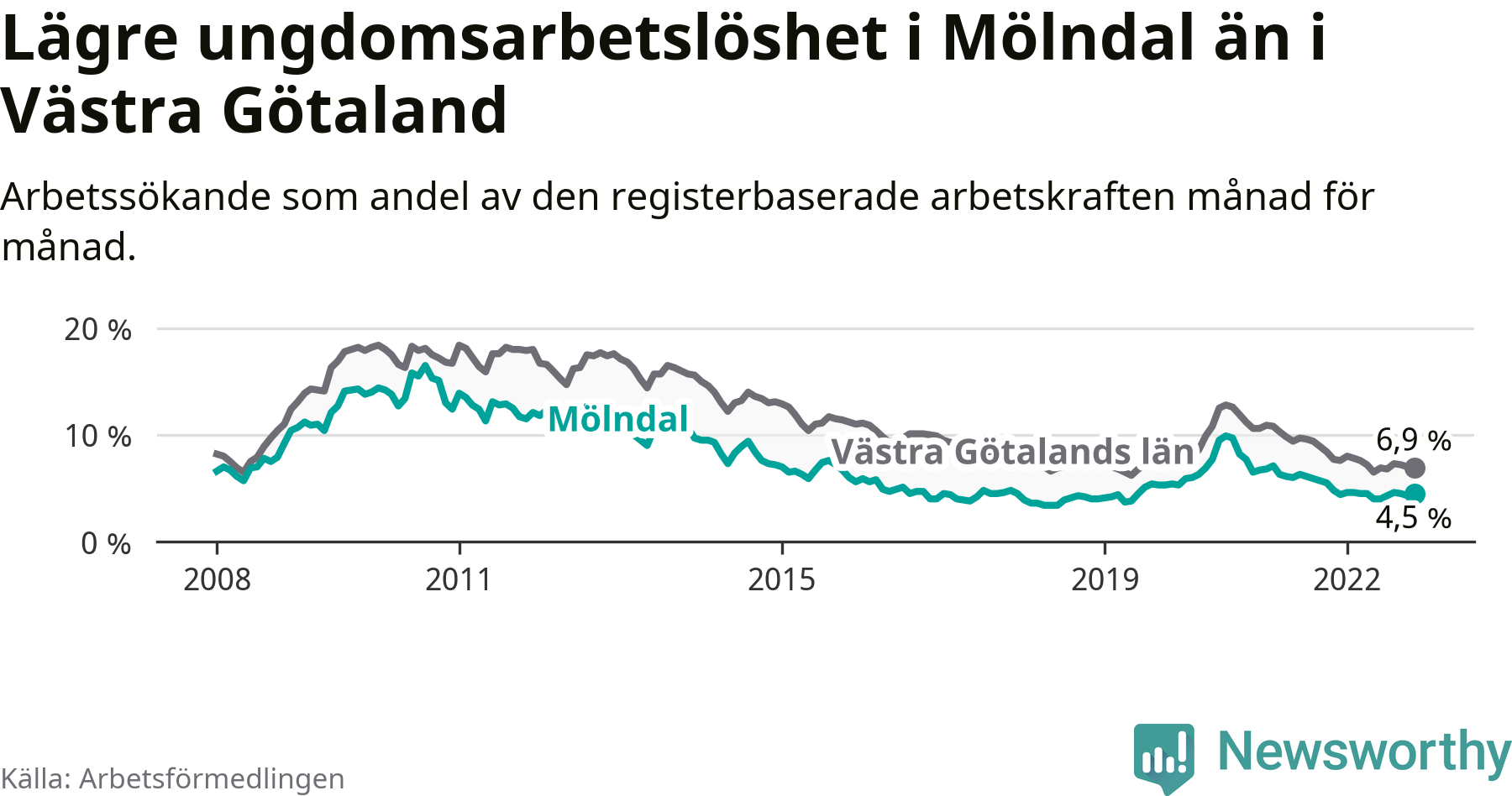 Precis som den totala arbetslösheten ligger ungdomsarbetslösheten i Mölndal lägre än i Västra Götaland som helhet. Skillnaden mellan kommunen och länet är 2,4 procentenheter.