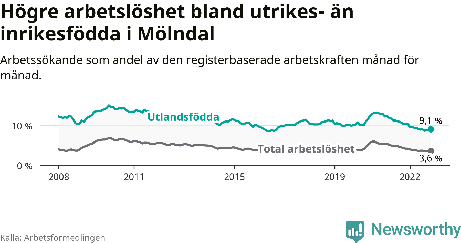Skillnaden i arbetslöshet mellan utrikesfödda och hela befolkningen är 5,5 procentenheter i Mölndal. Det är en mindre skillnad än för ett år sedan (−0,8 procentenheter).