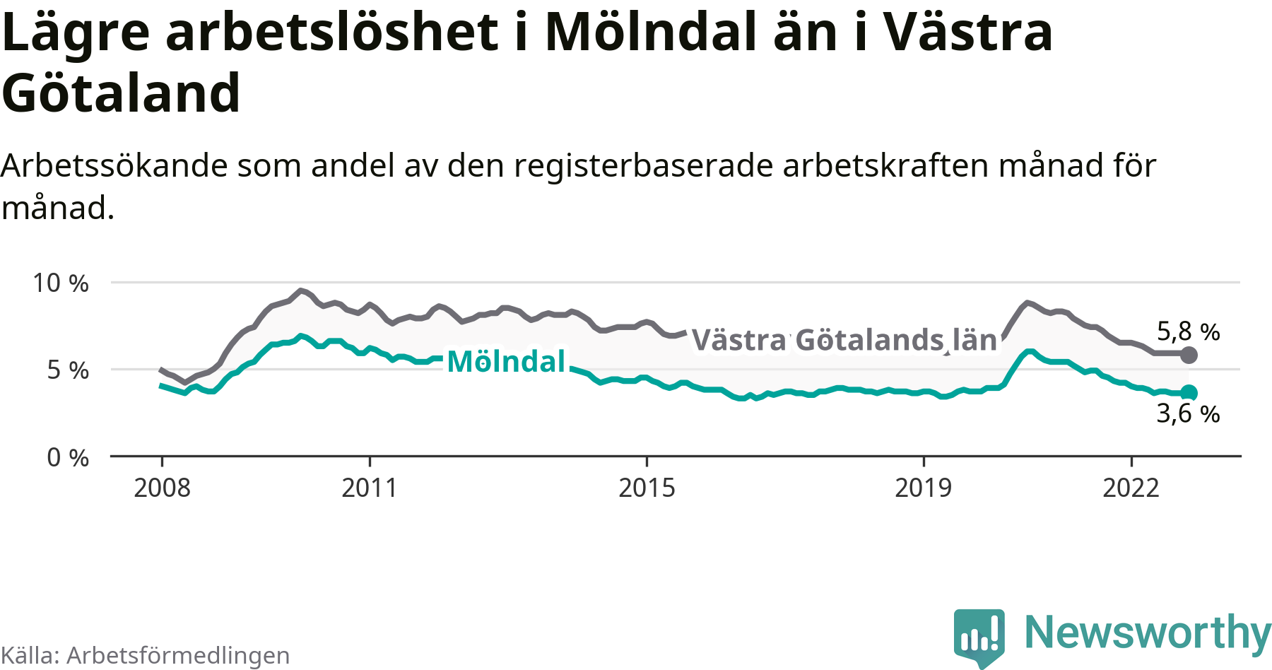 Mölndal hade redan tidigare lägre arbetslöshet än snittet i hela Västra Götalands län och nu växer klyftan (3,6 procent i kommunen, jämfört med 5,8 procent i hela länet). Öckerö har den lägsta arbetslösheten i länet (2,5 procent), medan Trollhättan och Åmål har den högsta (9,1 procent). För att Mölndal skulle komma ner i samma arbetslöshetsnivå som Öckerö skulle 409 personer behöva sysselsättas.