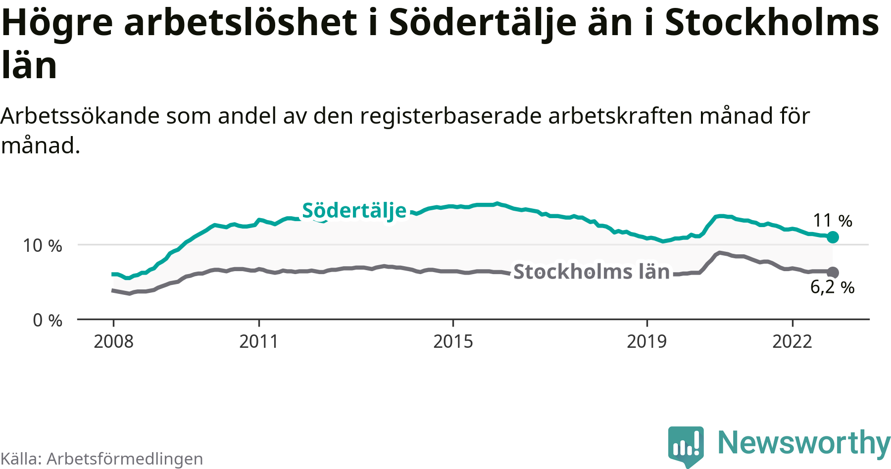 Även om arbetslösheten i Södertälje alltså minskar, så ligger den fortfarande över snittet i hela Stockholms län (11,0 procent i kommunen, jämfört med 6,2 procent i hela länet). Ekerö har den lägsta arbetslösheten i länet (3,1 procent), medan Botkyrka har den högsta (11,1 procent). För att Södertälje skulle komma ner i samma arbetslöshetsnivå som Ekerö skulle 3 988 personer behöva sysselsättas.
