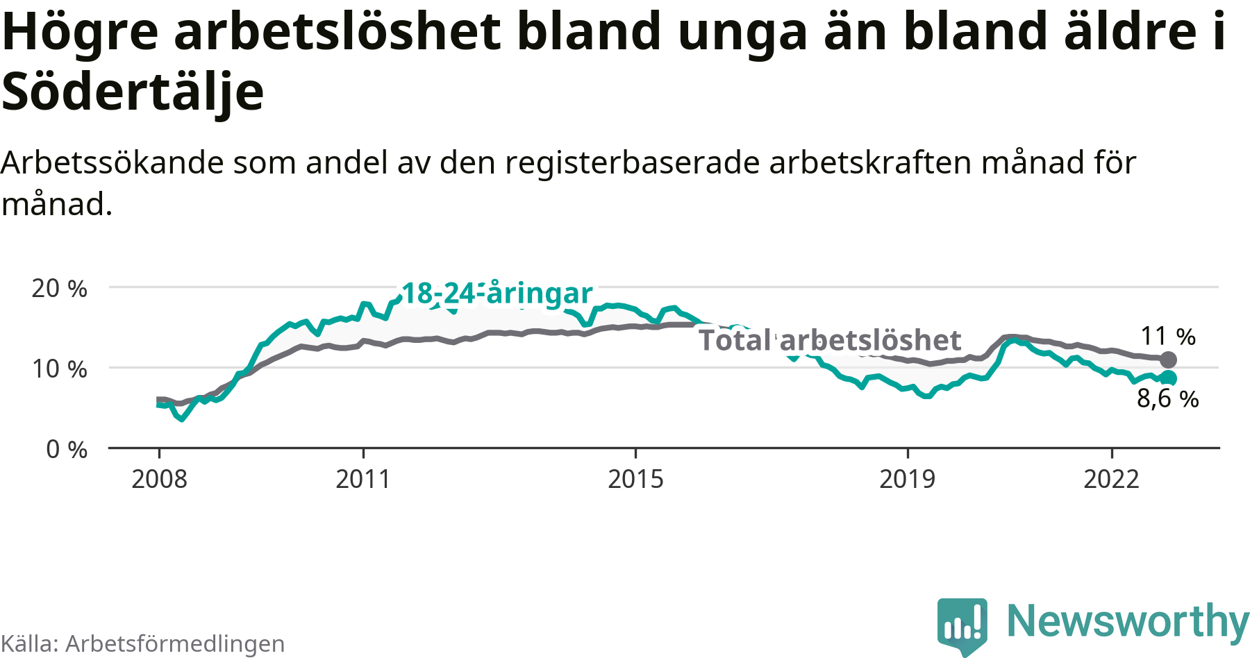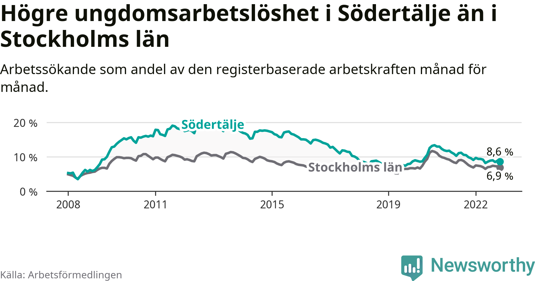 Precis som den totala arbetslösheten ligger ungdomsarbetslösheten i Södertälje högre än i Stockholms län som helhet. Skillnaden mellan kommunen och länet är 1,7 procentenheter.