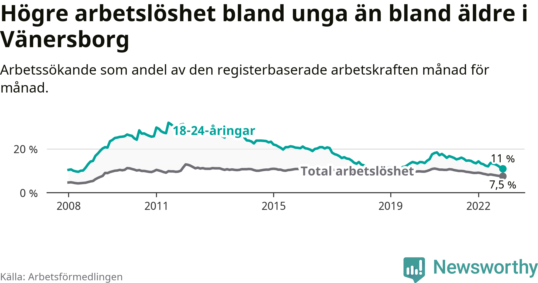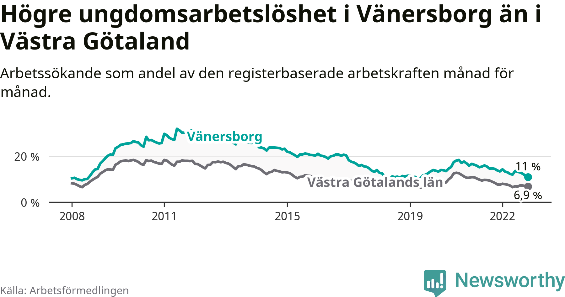 Precis som den totala arbetslösheten ligger ungdomsarbetslösheten i Vänersborg högre än i Västra Götaland som helhet. Skillnaden mellan kommunen och länet är 4,1 procentenheter.