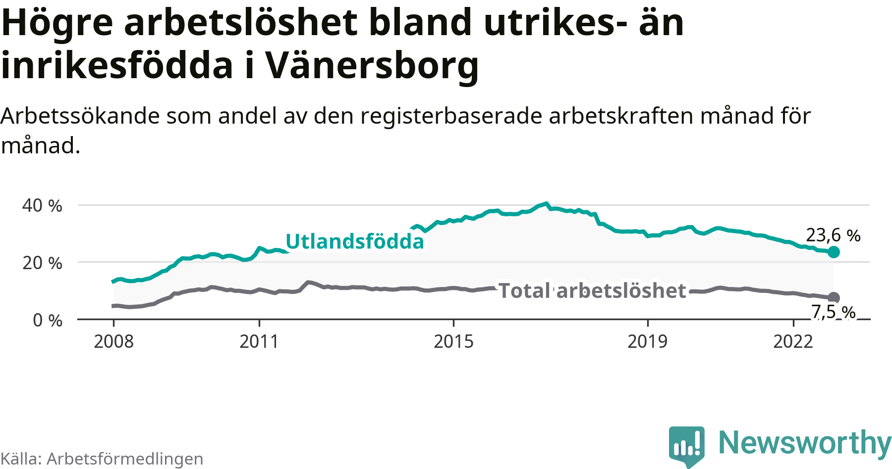 Arbetslösheten bland utlandsfödda var 23,6 procent i Vänersborg under november månad, motsvarande 790 av 3 347 personer. Det är 3,4 procentenheter färre än vid samma tidpunkt i fjol (−140 om man räknar personer). Därmed är de utlandsföddas arbetslöshet lägre än vid samma tidpunkt i fjol för 21:a månaden i följd. Sedan februari 2021 har arbetslösheten bland utlandsfödda minskat från 30,2 till 23,6 procent.