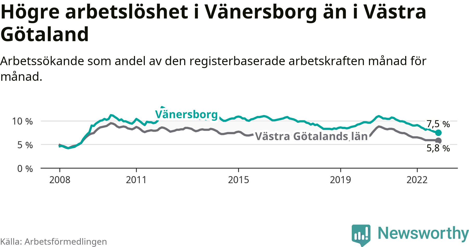 Även om arbetslösheten i Vänersborg alltså minskar, så ligger den fortfarande över snittet i hela Västra Götalands län (7,5 procent i kommunen, jämfört med 5,8 procent i hela länet). Öckerö har den lägsta arbetslösheten i länet (2,5 procent), medan Trollhättan och Åmål har den högsta (9,1 procent). För att Vänersborg skulle komma ner i samma arbetslöshetsnivå som Öckerö skulle 915 personer behöva sysselsättas.