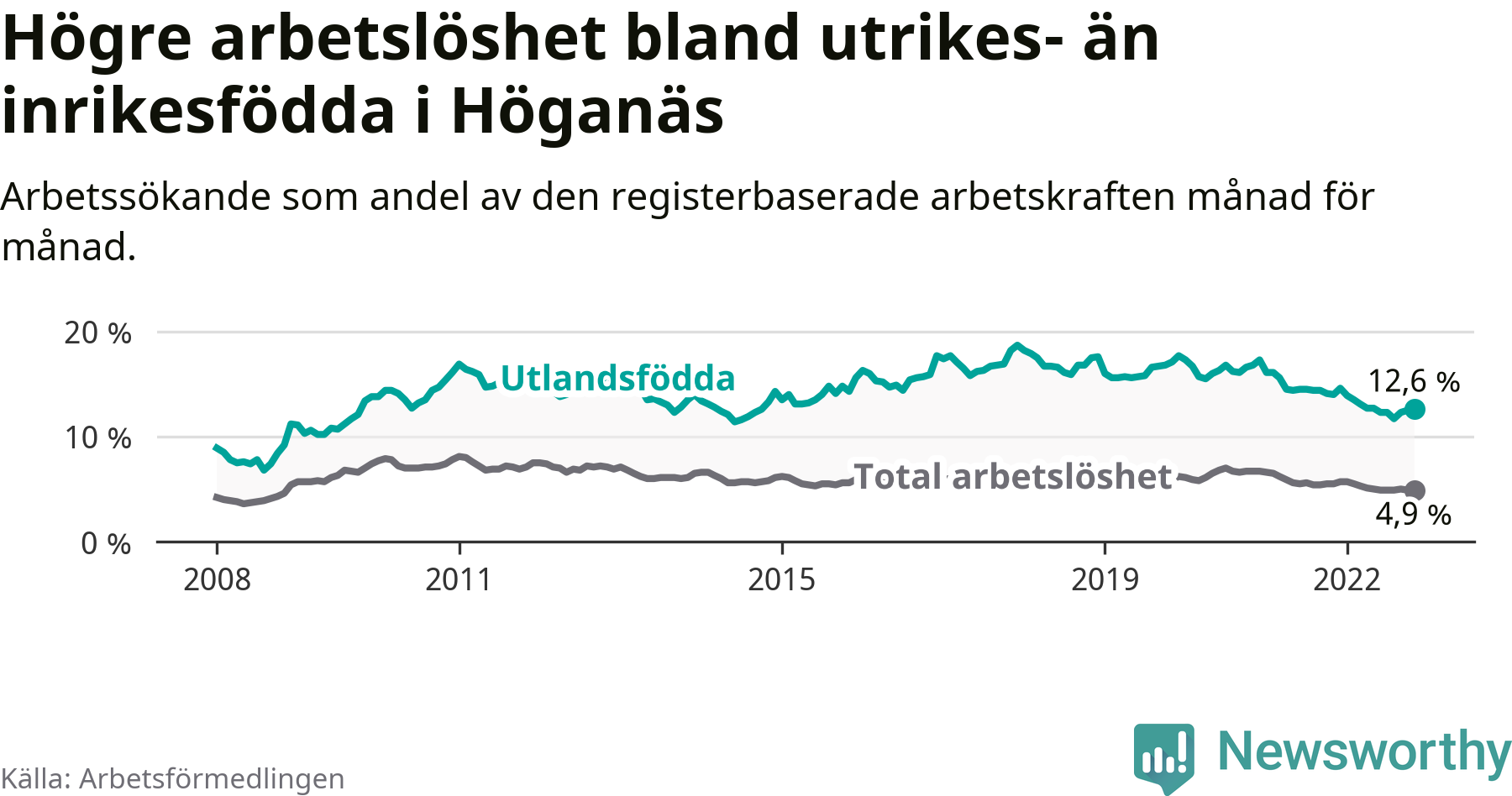 Arbetslösheten bland utlandsfödda var 12,6 procent i Höganäs under november månad, motsvarande 248 av 1 968 personer. Det är 1,4 procentenheter färre än vid samma tidpunkt i fjol (−21 om man räknar personer). Därmed har de utlandsföddas arbetslöshet varit lägre än vid samma tidpunkt i fjol i över två år i sträck. Sedan juli 2020 har arbetslösheten bland utlandsfödda minskat från 16,8 till 12,6 procent.