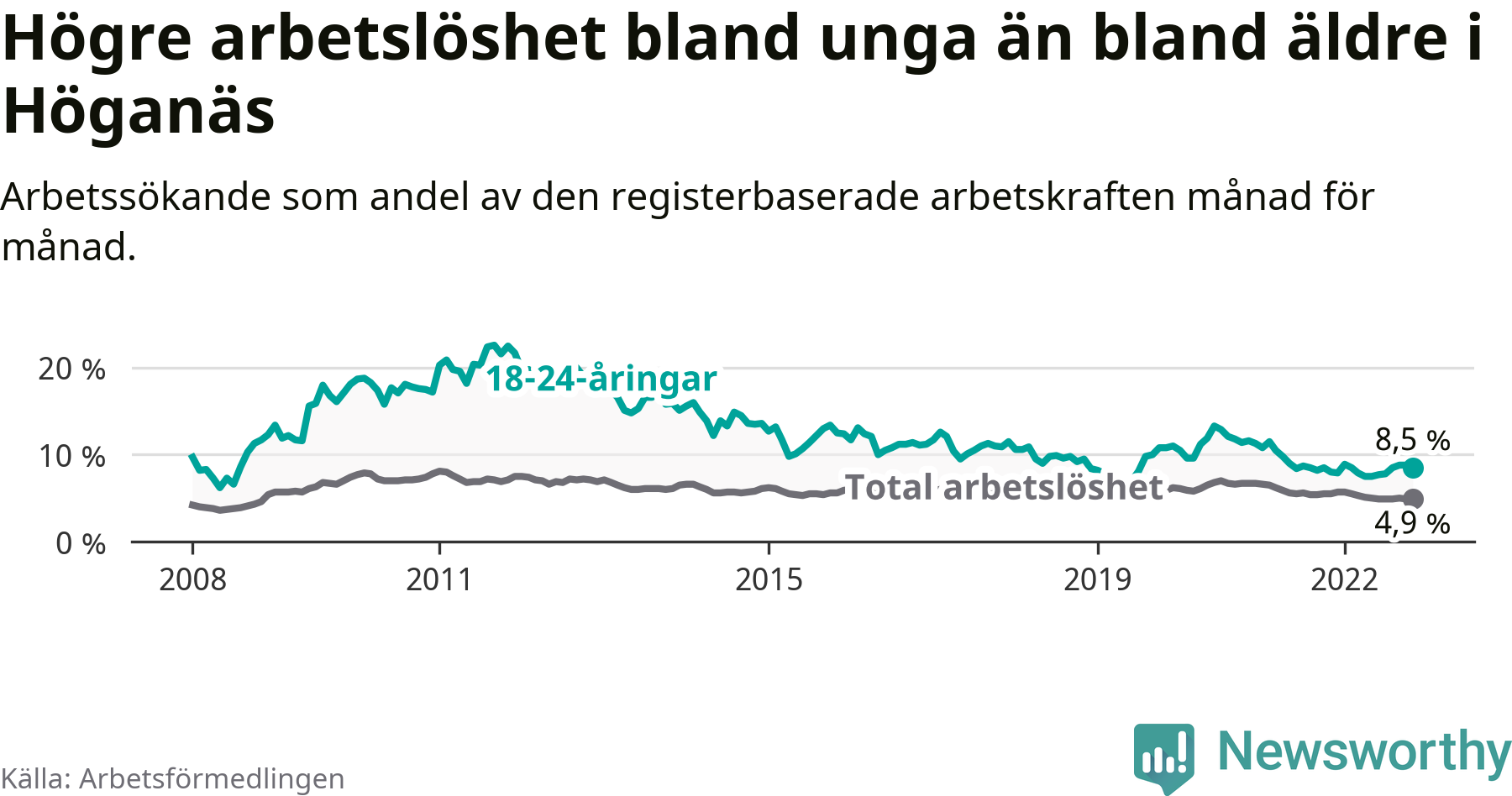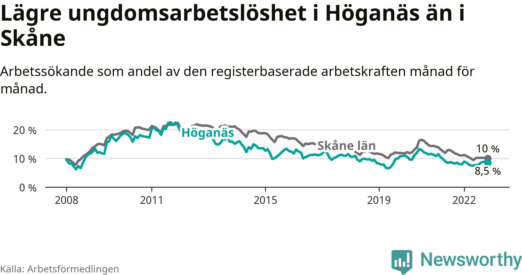 Precis som den totala arbetslösheten ligger ungdomsarbetslösheten i Höganäs lägre än i Skåne som helhet. Skillnaden mellan kommunen och länet är 1,5 procentenheter.