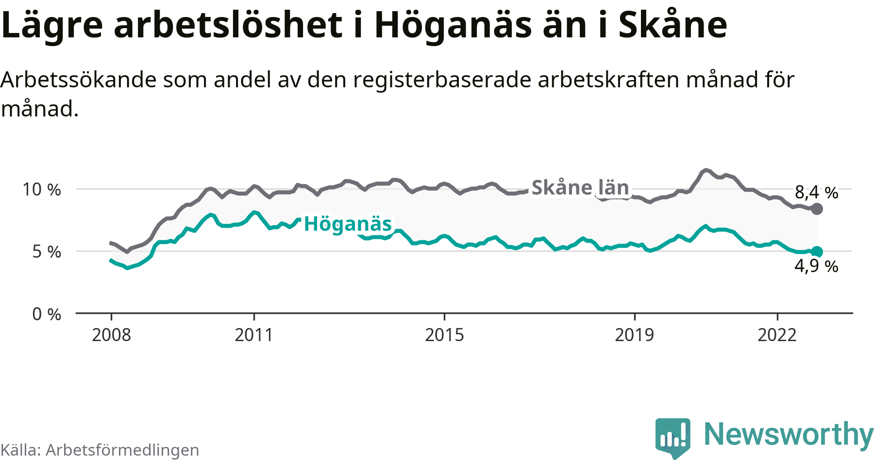 Höganäs hade redan tidigare lägre arbetslöshet än snittet i hela Skåne län och nu växer klyftan (4,9 procent i kommunen, jämfört med 8,4 procent i hela länet). Lomma och Vellinge har den lägsta arbetslösheten i länet (3,2 procent), medan Perstorp har den högsta (12,6 procent). För att Höganäs skulle komma ner i samma arbetslöshetsnivå som Lomma och Vellinge skulle 200 personer behöva sysselsättas.