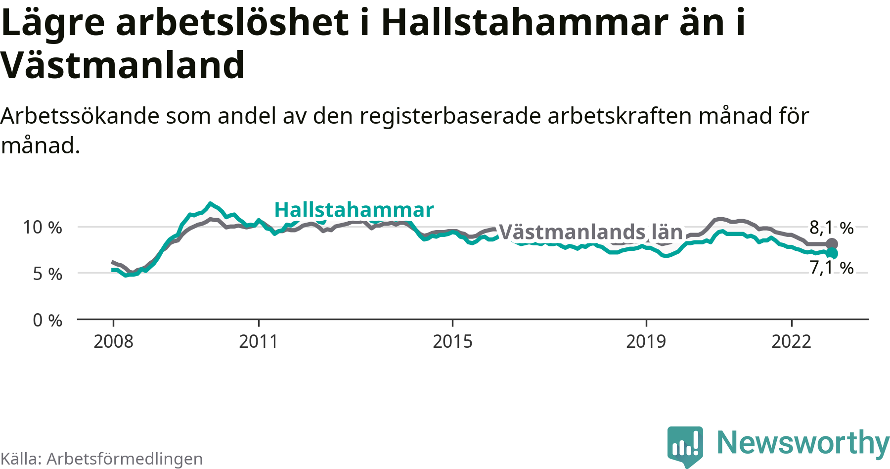 Hallstahammar hade redan tidigare lägre arbetslöshet än snittet i hela Västmanlands län och nu växer klyftan (7,1 procent i kommunen, jämfört med 8,1 procent i hela länet). Surahammar har den lägsta arbetslösheten i länet (6,3 procent), medan Fagersta har den högsta (10,6 procent). För att Hallstahammar skulle komma ner i samma arbetslöshetsnivå som Surahammar skulle 61 personer behöva sysselsättas.