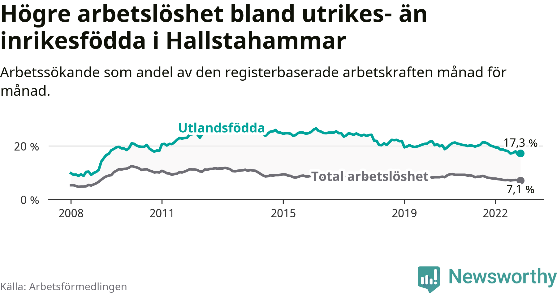 Skillnaden i arbetslöshet mellan utrikesfödda och hela befolkningen är 10,2 procentenheter i Hallstahammar. Det är en betydligt mindre skillnad än för ett år sedan (−2,0 procentenheter).