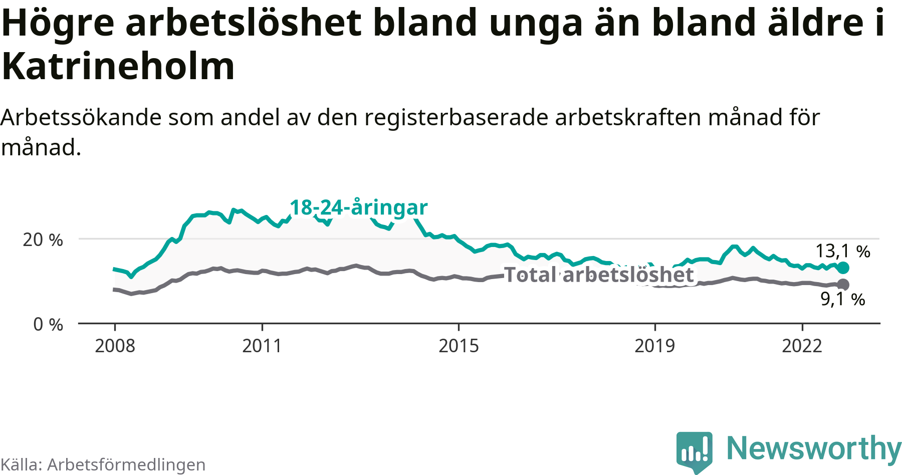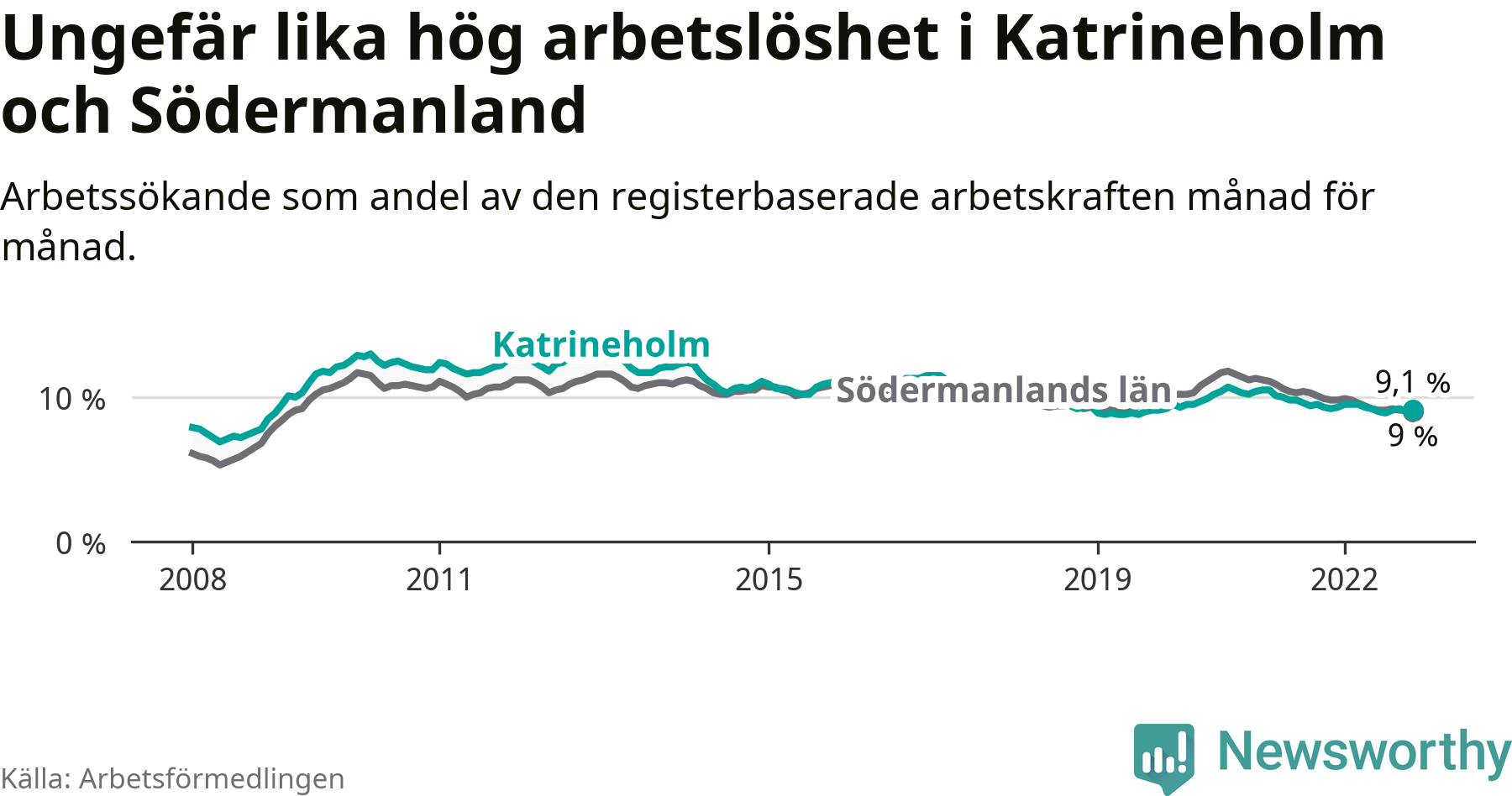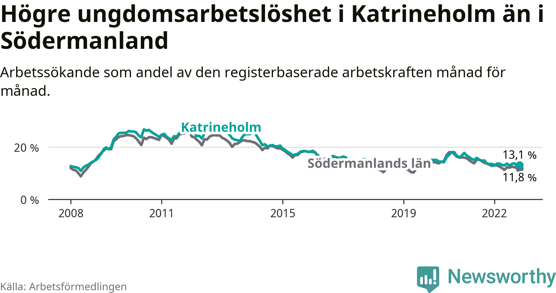 Medan Katrineholm har ungefär samma total arbetslöshet som Södermanland, ligger ungdomsarbetslösheten 1,3 procentenheter högre i Katrineholm.