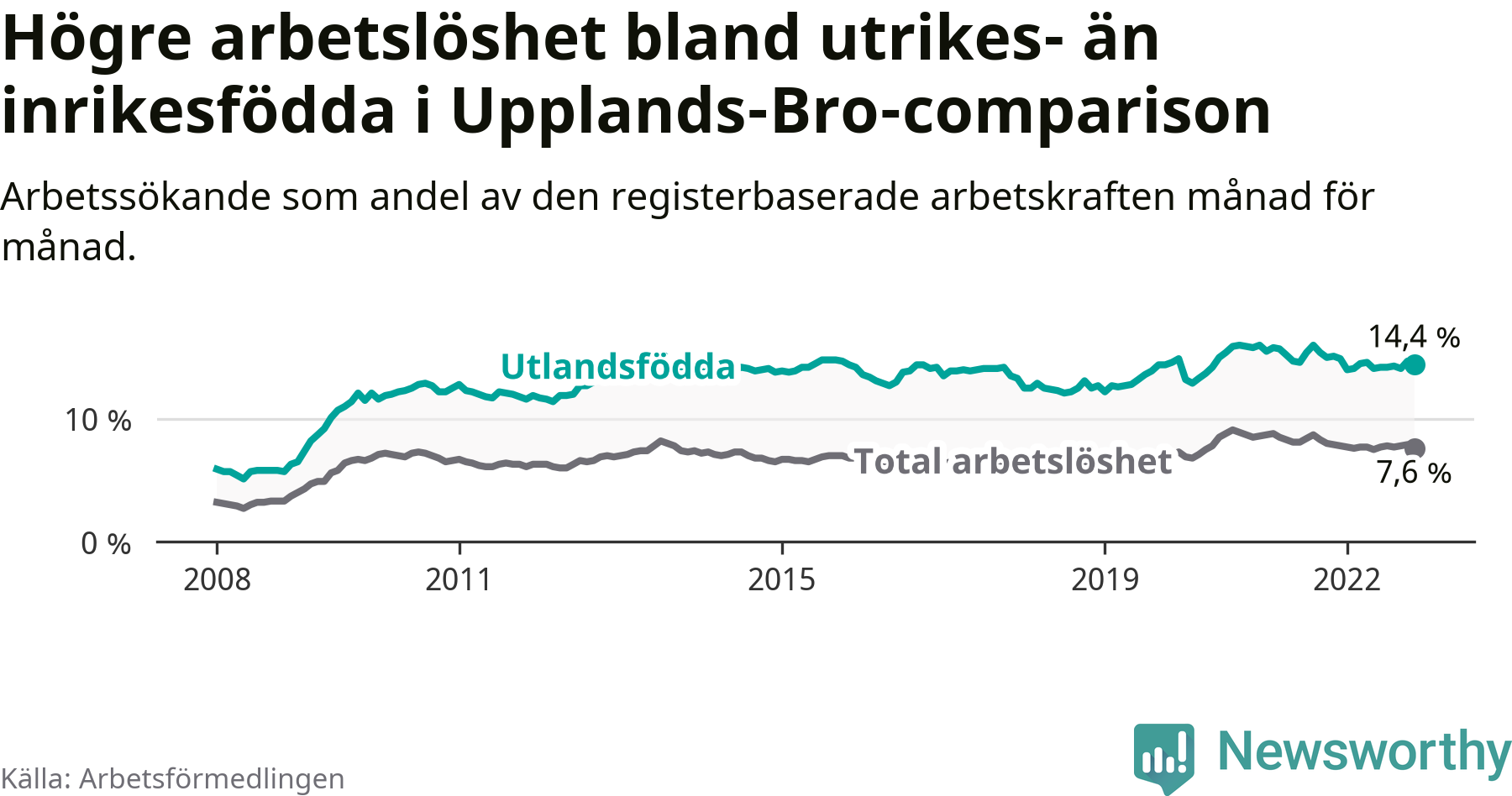 | Bland utlandsfödda | 14,4 % | −0,7 % ▼ | 12,9 % | −0,8 % ▼ | 16,5 % | −1,3 % ▼ |