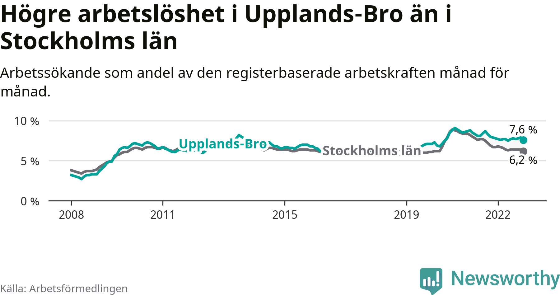 Även om arbetslösheten i Upplands-Bro alltså minskar, så ligger den fortfarande över snittet i hela Stockholms län (7,6 procent i kommunen, jämfört med 6,2 procent i hela länet). Ekerö har den lägsta arbetslösheten i länet (3,1 procent), medan Botkyrka har den högsta (11,1 procent). För att Upplands-Bro skulle komma ner i samma arbetslöshetsnivå som Ekerö skulle 694 personer behöva sysselsättas.