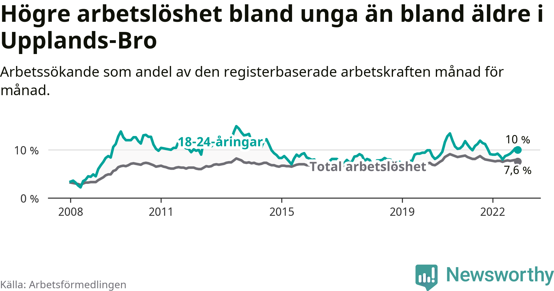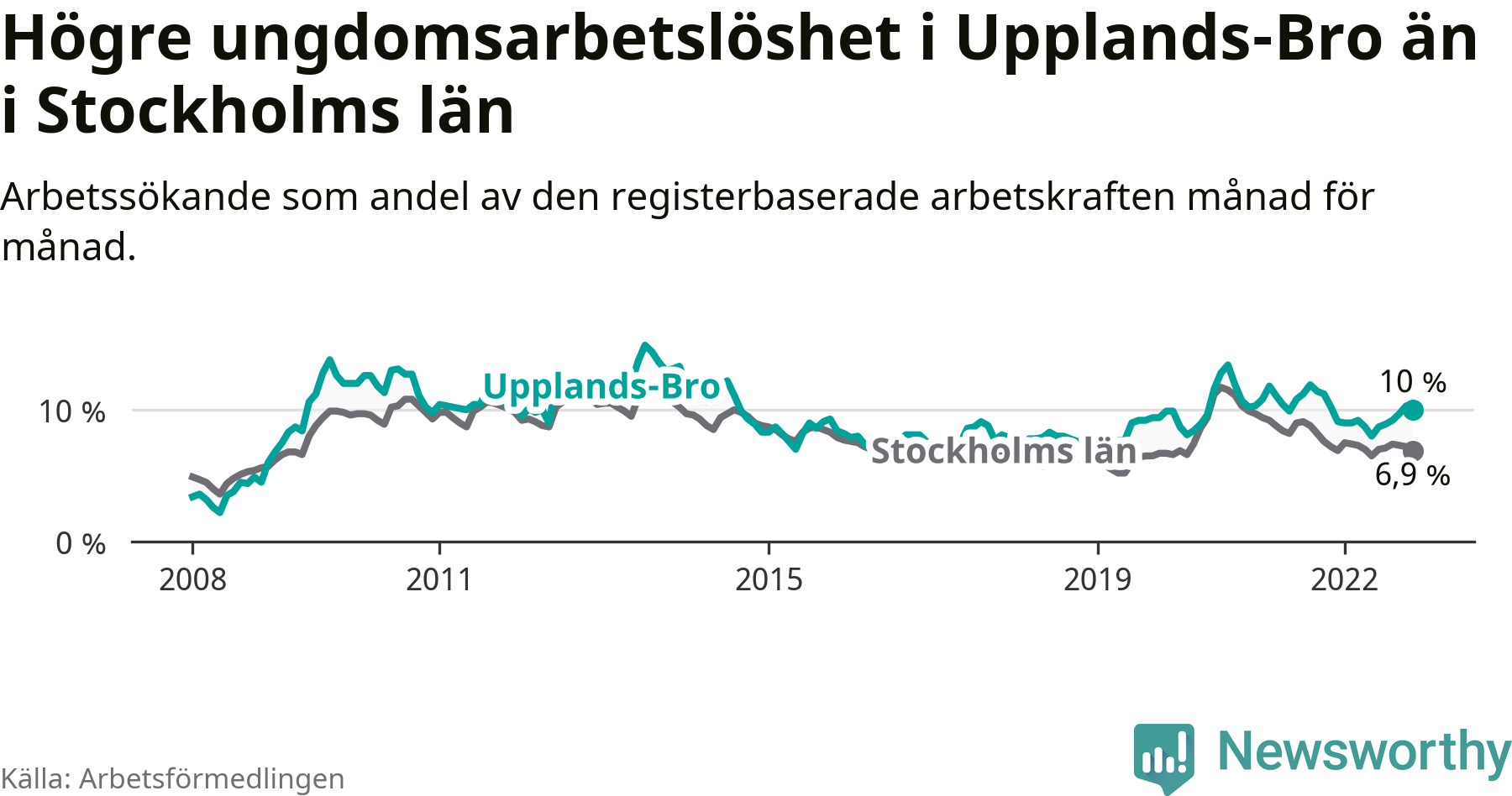 Precis som den totala arbetslösheten ligger ungdomsarbetslösheten i Upplands-Bro högre än i Stockholms län som helhet. Skillnaden mellan kommunen och länet är 3,1 procentenheter.