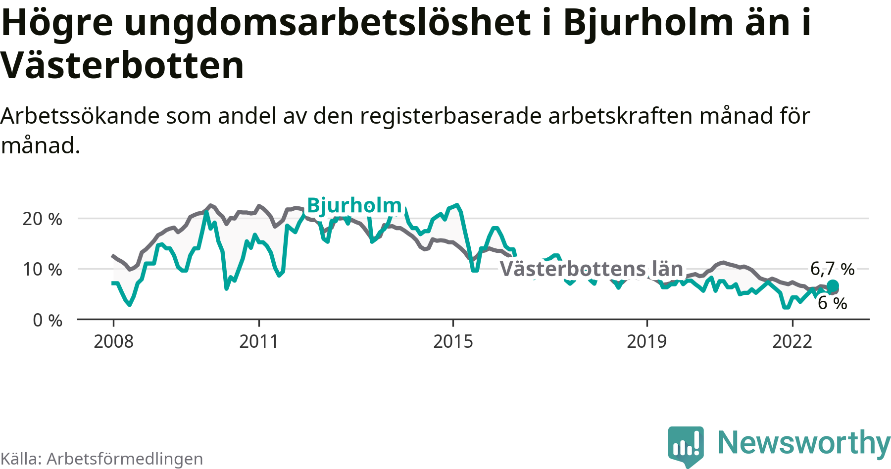 Bjurholms kommun såg under november en svagare utveckling på arbetsmarknaden för unga än länet. Kommunen har passerat Västerbottens län och har nu högre ungdomsarbetslöshet.