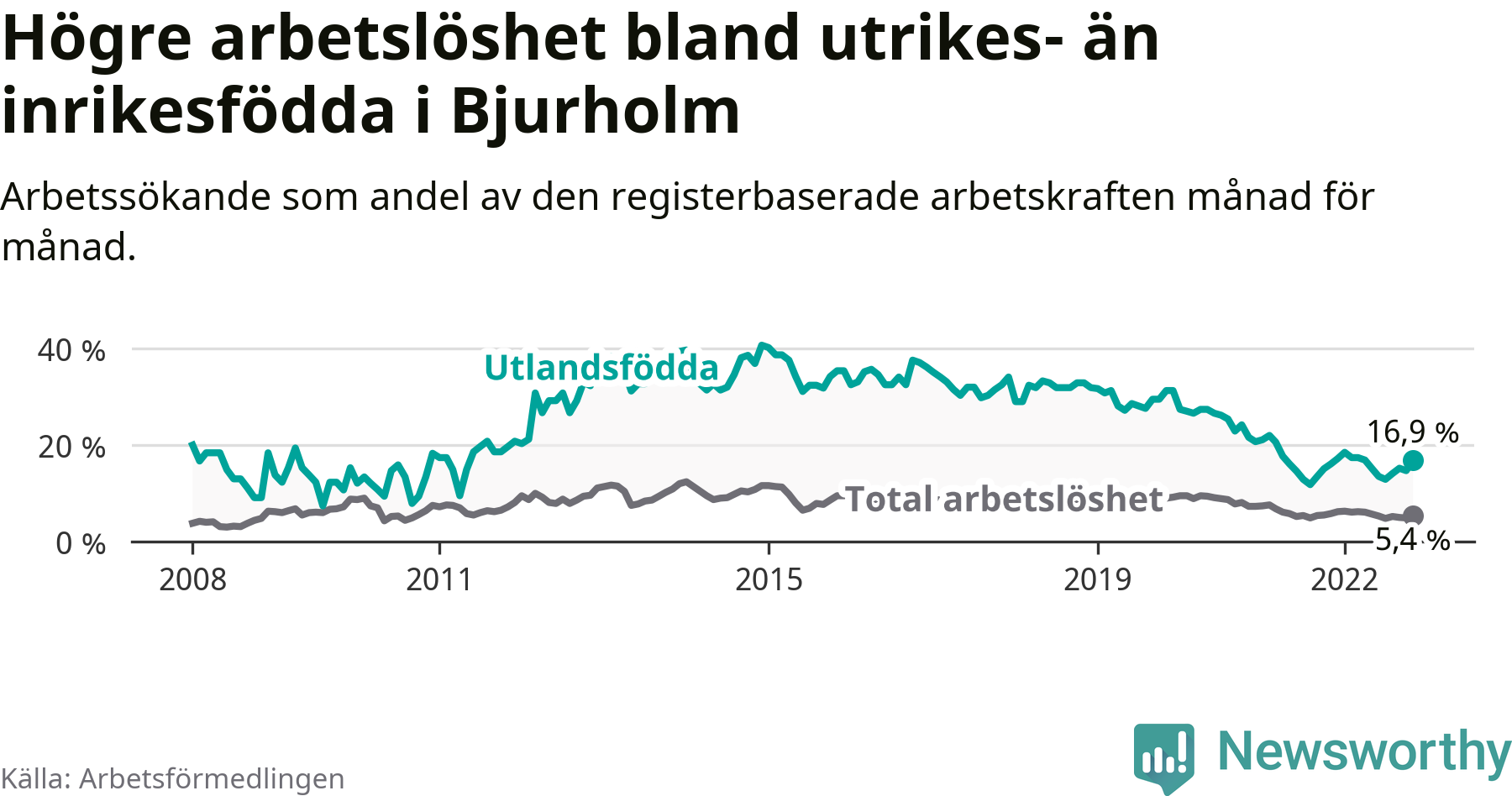 | Bland utlandsfödda | 16,9 % | +0,8 % ▲ | 12,2 % | −2,4 % ▼ | 16,5 % | −1,3 % ▼ |