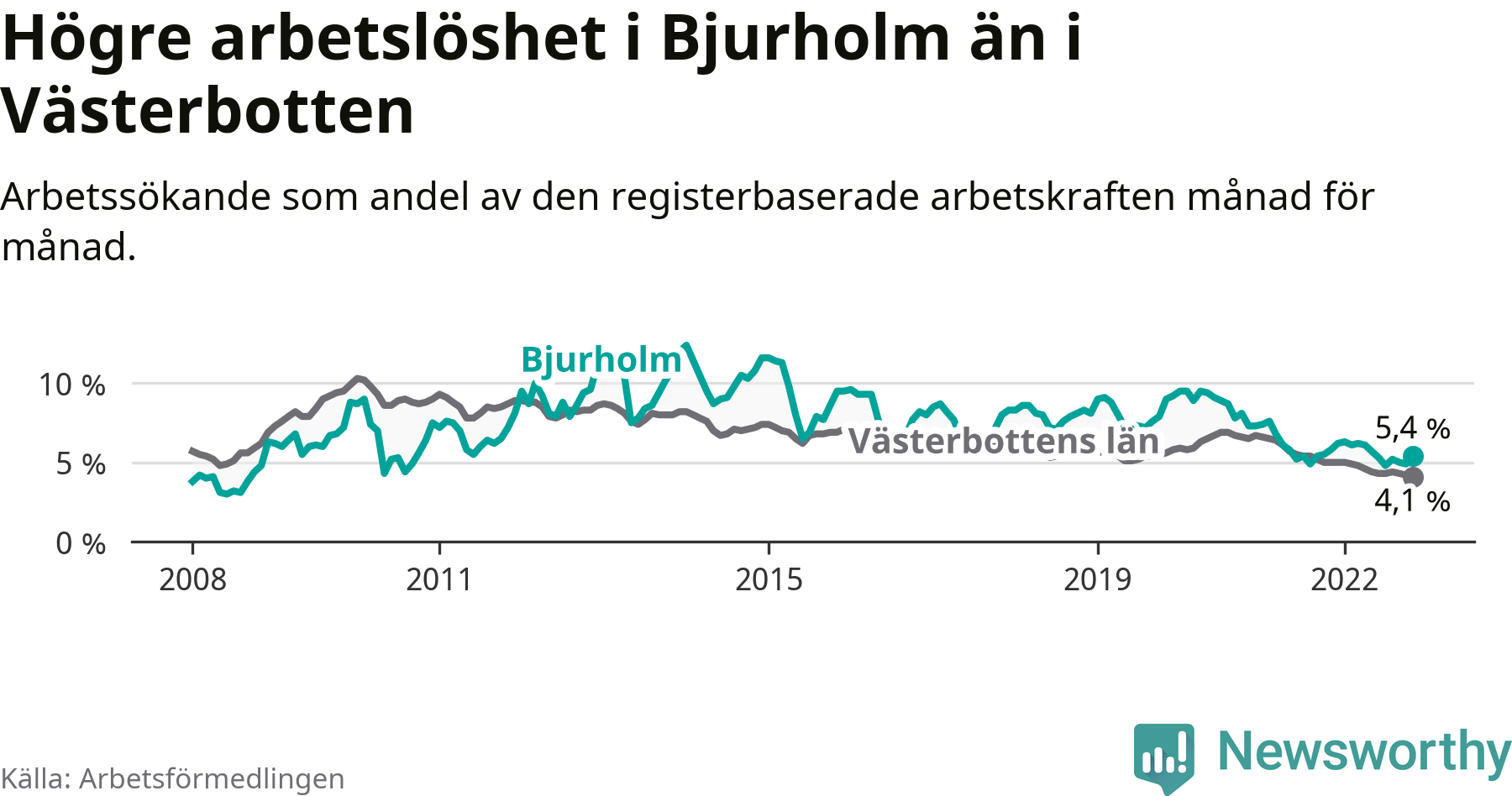 Under november månad rapporterade Bjurholms kommun en total arbetslöshet på 5,4 procent. Det är en minskning jämfört med samma tidpunkt i fjol (−0,4 procentenheter). Även i Västerbottens län sjunker arbetslösheten .