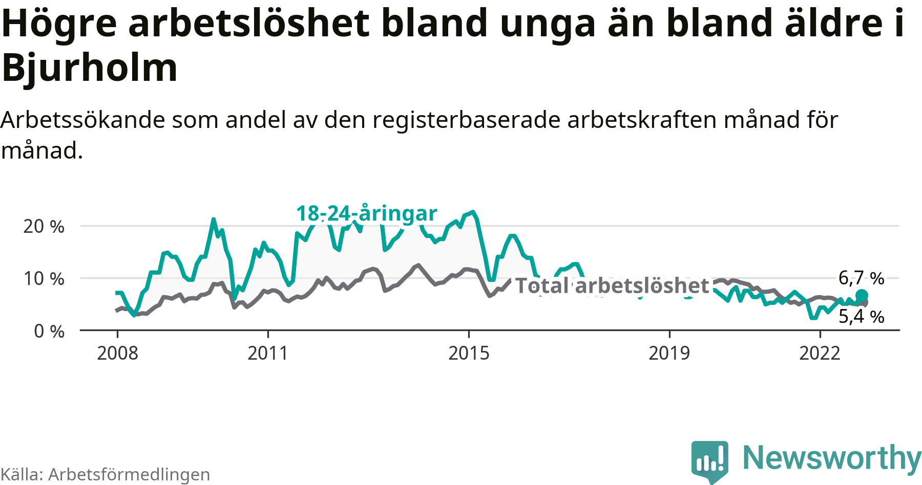 Till skillnad från den totala arbetslösheten stiger arbetslösheten bland unga (+4,4 procentenheter). I november var 6,7 procent av 18–24-åringarna inskrivna som arbetssökande (motsvarande åtta personer). Mäter vi antalet inskrivna ser vi en ökning med fem personer på ett års sikt.